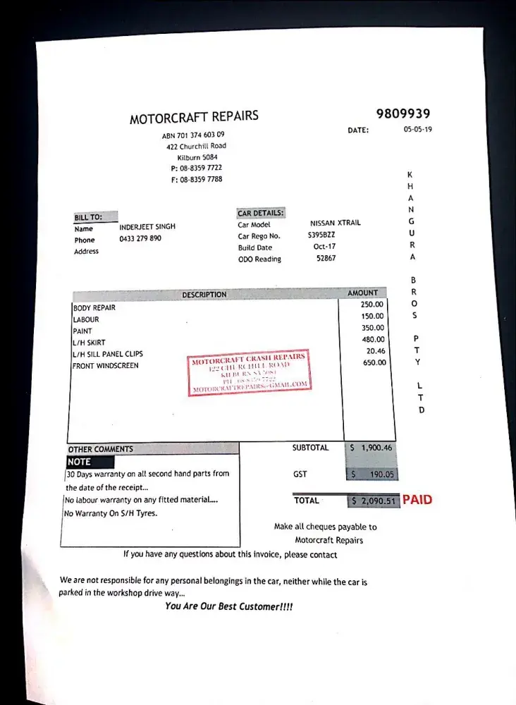 I had repaired my vechile from certificate crash repair the repair cost was $2090.51 Plz download attach documents and let me know about payment .
