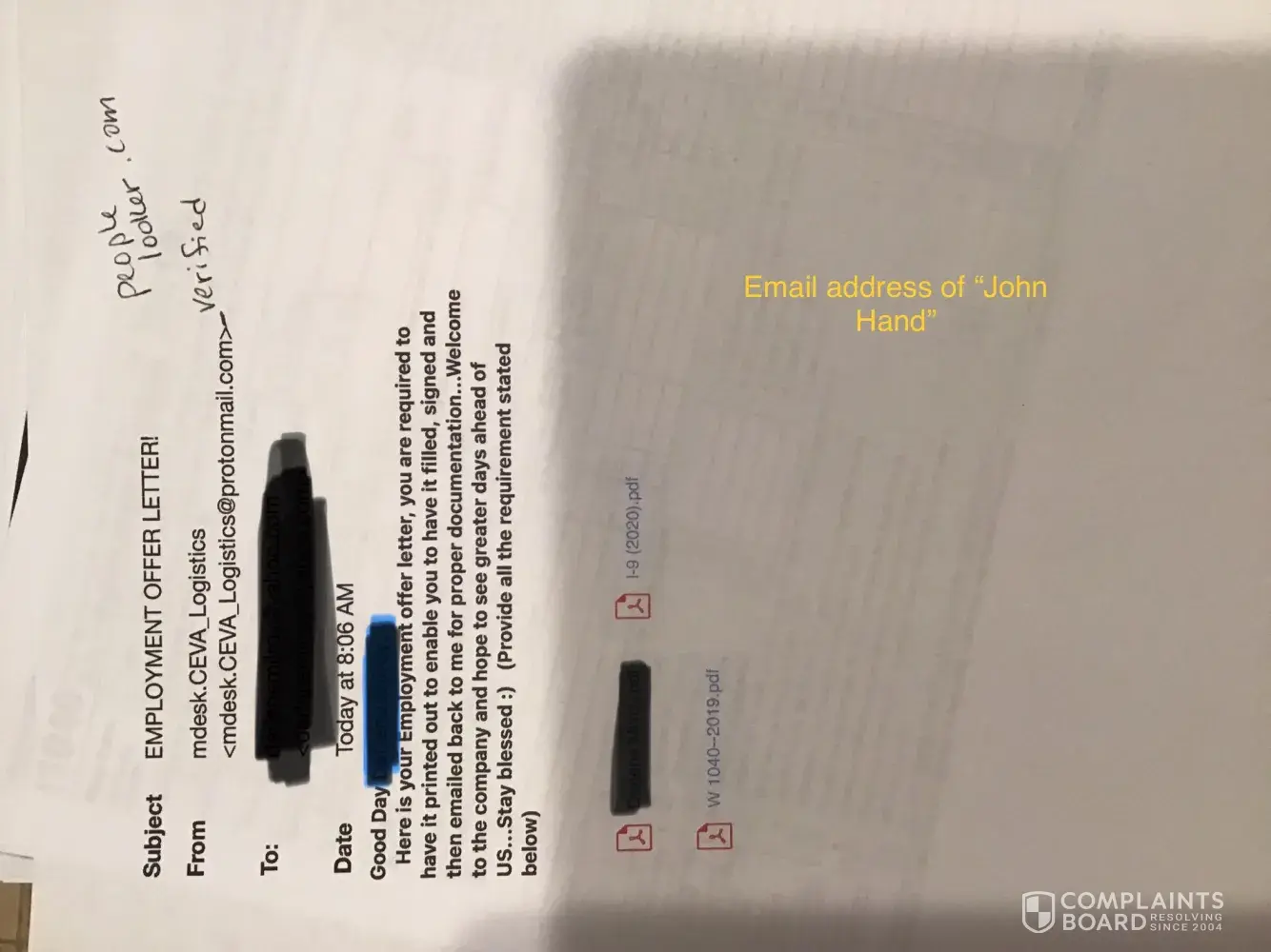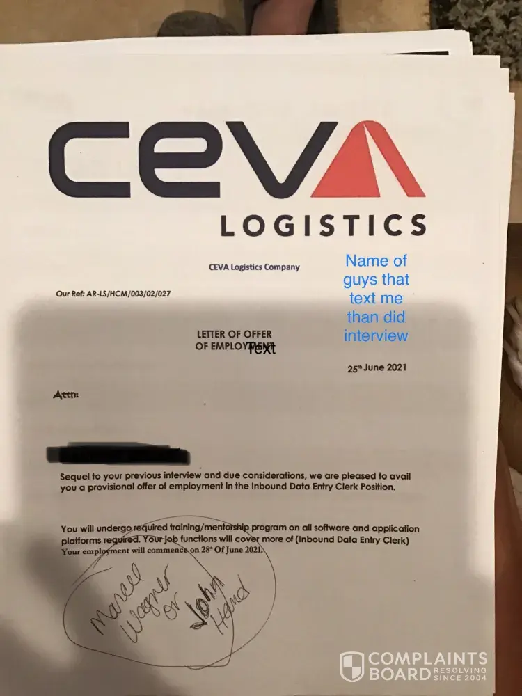 June 24, 2021 I was contacted by a Ceva Employee who was to hook me up with a Interviewer for a job opportunity. Hour and a half later low and behold I got the job. Great Pay, Great benefits work from home. Ok 🚩 red flags go up by the next morning and after I signed contract and filled out paperwork. Yes my SS# and all… Than it started with I needed to get the equipment bought to start by Monday. Again I had already felt like something wasn't right so I played along and kept putting the Supervisor/interviewer off as he grew angrier and angrier. He finally broke down and sent me a fake check to deposit into my account thru remote deposit mind you. And by the time my bank would have caught it he would have been long gone and had my bank info too.