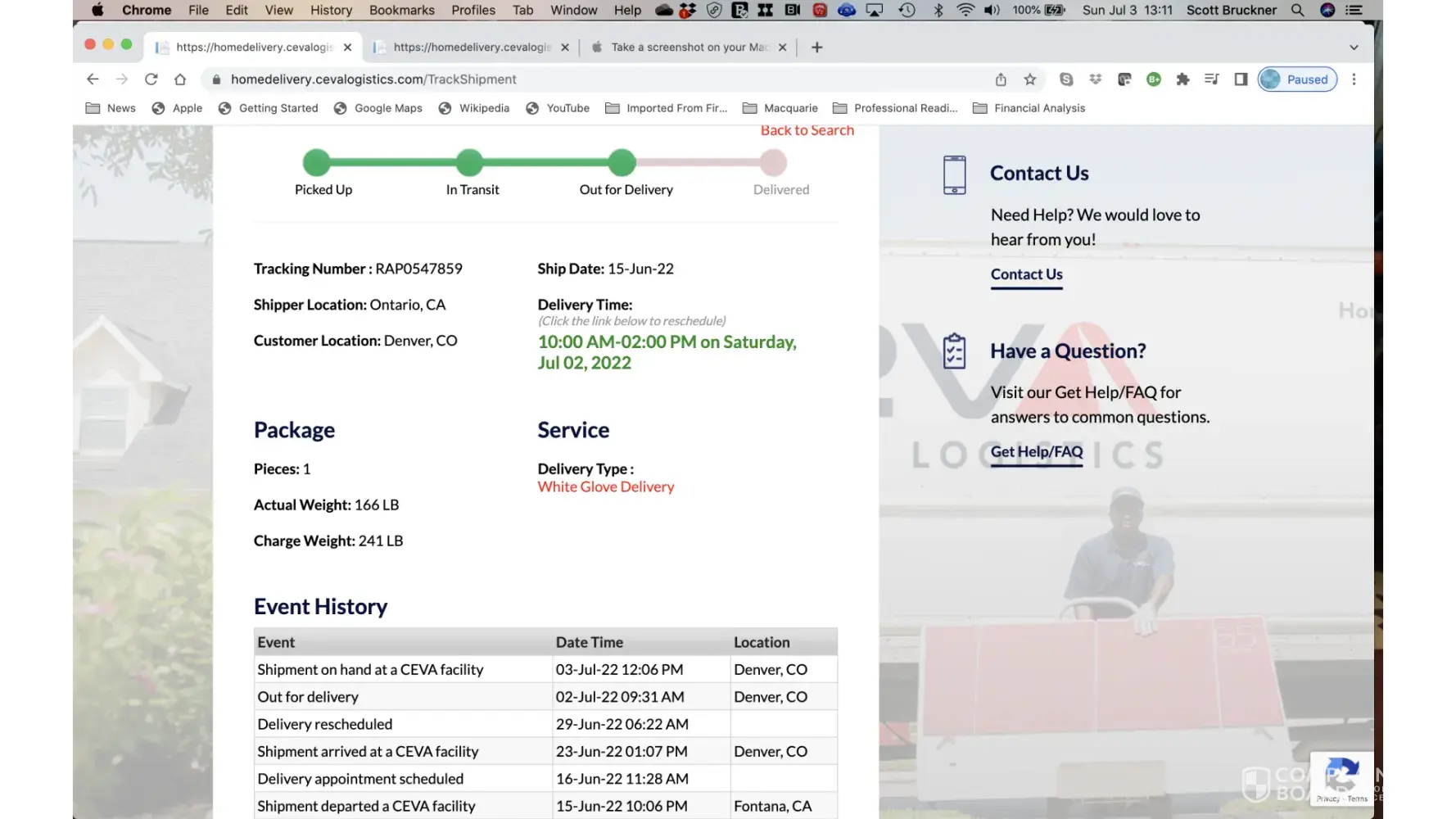 CEVA is the logistics company that the retailer from which I purchased two accent cabinets uses to deliver products. I have been contacted by CEVA 3 times to schedule delivery (June 16, 2022; June 28, 2022; and July 2, 2022). On each of these dates no one from CEVA ever showed up. On the most recent scheduled delivery date (July 2, 2022) I tracked the product and saw that its status was changed to out for delivery. Again, I waited at home all day but no one from CEVA contacted me and no one from CEVA showed up. I now see that the product status has been updated on July 3 at 12:06 pm to say that the shipment is on hand at the CEVA facility. I have emailed CEVA, I have called CEVA and yet I have never received a reply from them. I am now working with the retailer to get my money back. I am now concerned that the CEVA status tracker misinforms customers or that CEVA is a scam operation that takes money and never follows through with its contractual obligation to complete a delivery. My tracking number is RAP0547859. To the extent you can get anyone at this company to give you an accurate and honest reply as to what the problem is...or if you can even get my product delivered to me, I would be very grateful.