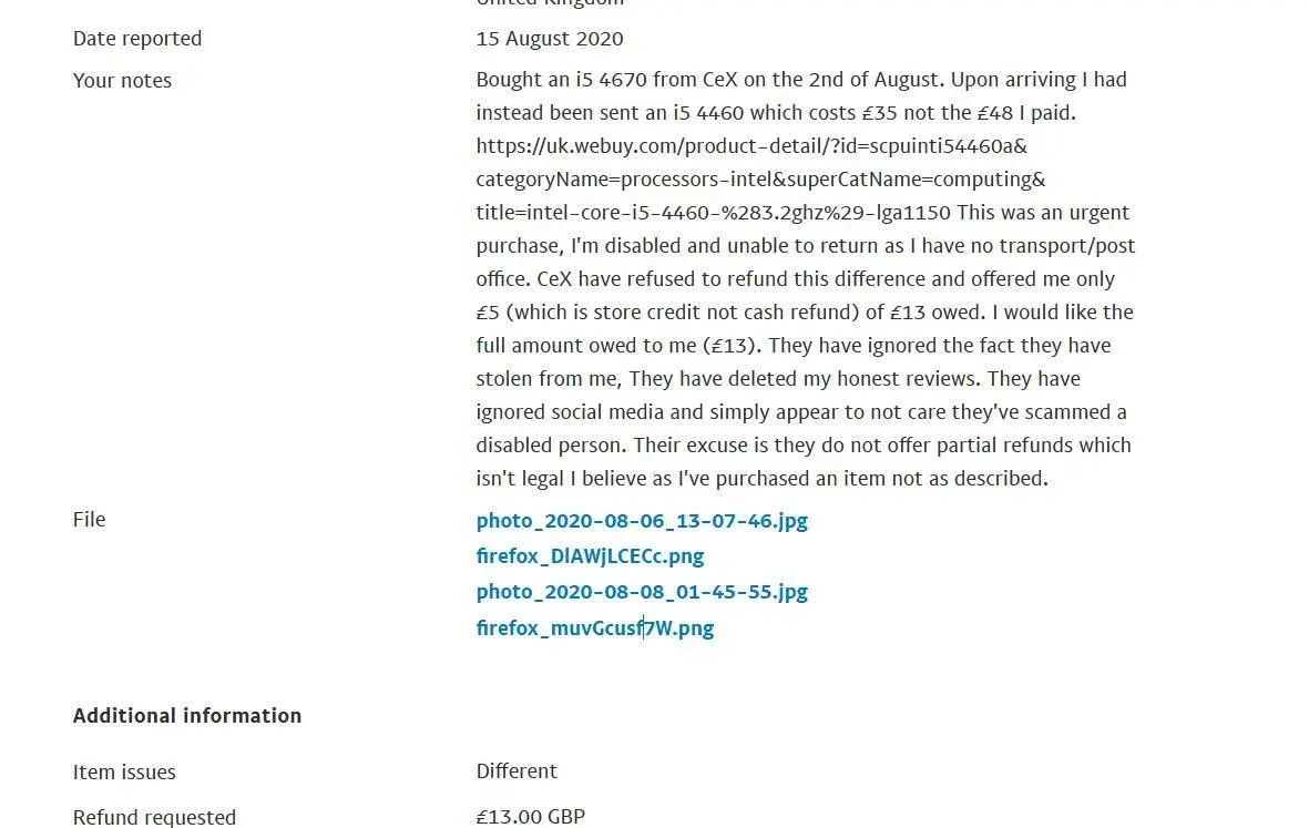 I disputed with paypal and CeX took almost a month to reply, after two messages repeating my past issues paypal have sided with CeX and are forcing me to return not only the CPU I bought but the ram that I bought which was fine.