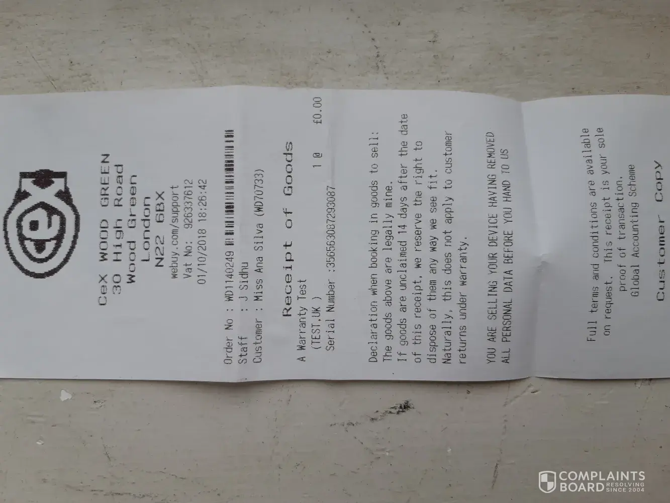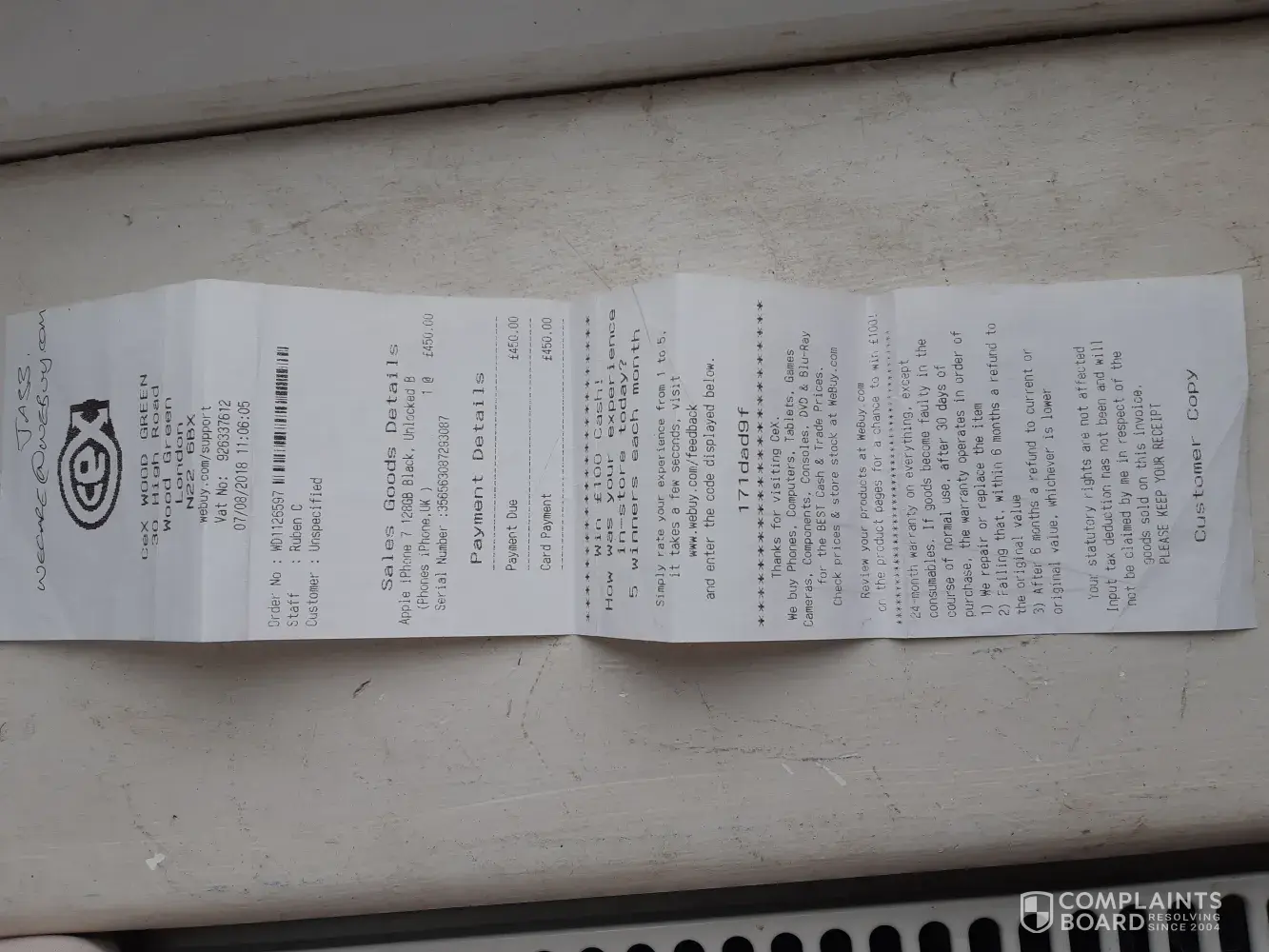 Background: I purchased an iPhone 6 128GB Space Grey (serial number: [protected]) in 2017 and, having had it for less than 1 year, whilst on holiday in Iceland it ran out of battery and then never turned back on again despite charging. Following testing at the Cex Shop in Windsor, where I bought the phone, I was told that the phone would not work again due to "water damage" and despite still being in the warranty period the phone would not be covered by the warranty. The phone was never exposed to any water or any condensation or other water vapour during my ownership and at the time I questioned this with the branch manager (and explained that the damage must have been there when I bought the phone) however despite numerous discussions nothing was done to deal with my concerns and as I was in urgent need for a new phone I traded in that phone for a new iPhone 6S (details above) at the same Cex store in Windsor (the New Phone).