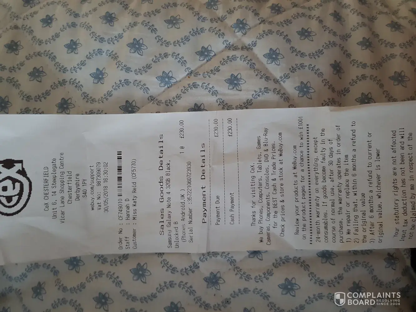 The issue that I have experienced was: bought Samsung galaxy note 4 for £230 on the 30th may 2018 I have taken it in to store today 17th July 2018 with more than 1 fault with the phoneÂ