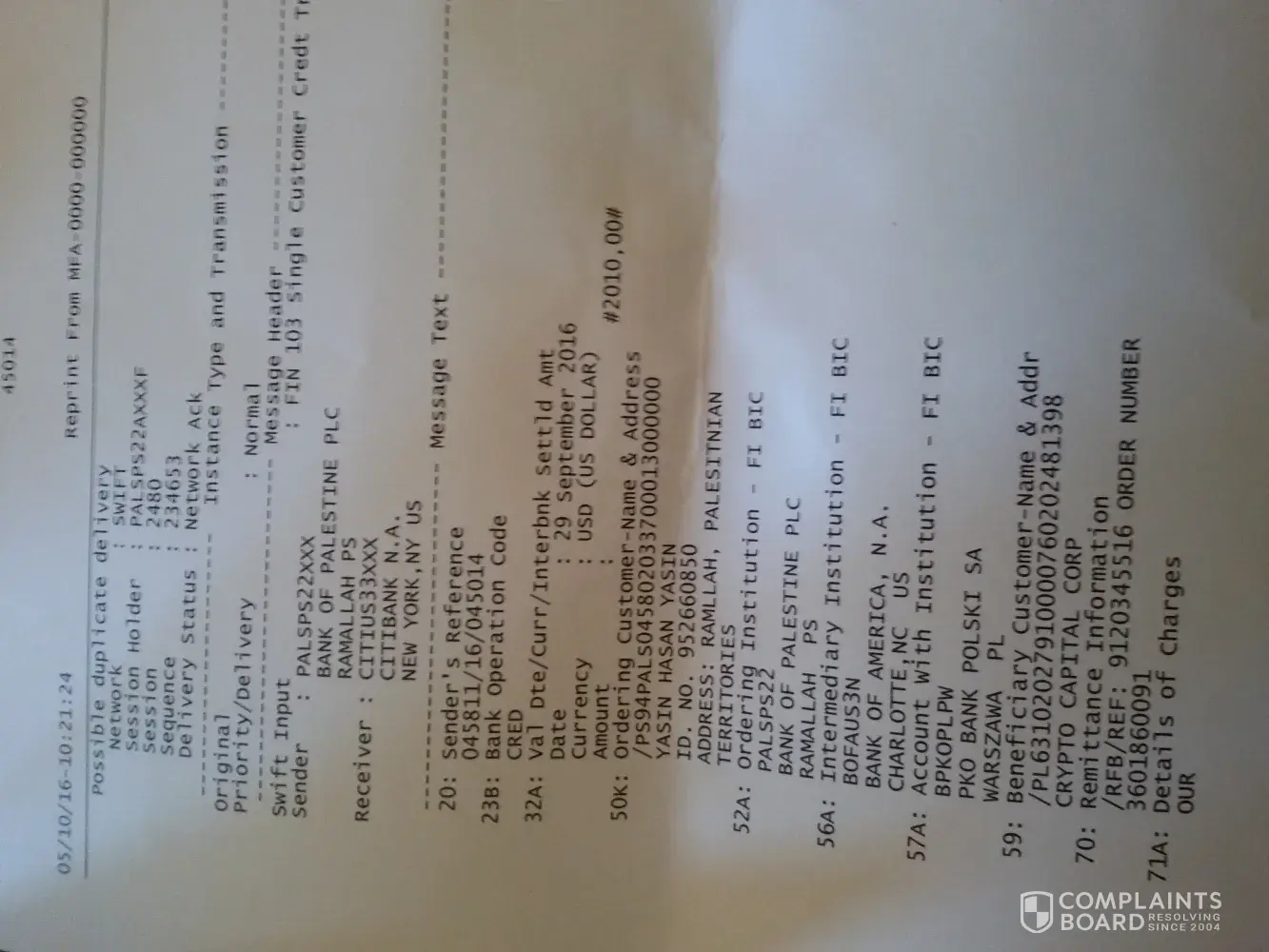 on Sep.29.2016 i send a swift amount of 2010$ to cex.io as i have and acount there, since that date and they refuse to admit that they receive the money, i send them all the proof (swift slip) and after that my bank investigate with the corespondent- bank and they also confirm that the money credited to there account on sep.29, they all the time responded the same: is to ask my back to restore the amount from the corespondent- bank but my bank responded that there is no way to restore back the money after credited to cex.io acount,