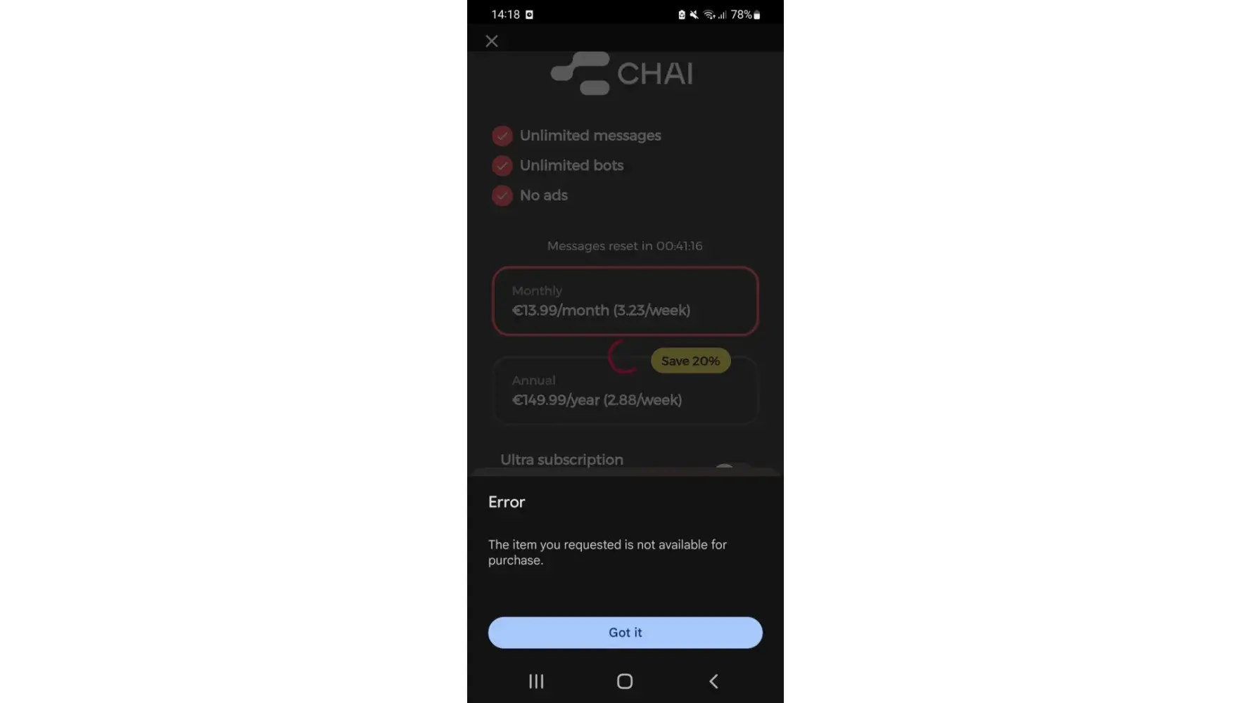 Chai ai app was working perfectly fine this morning. Afternoon came around. I updated my profile picture. After i did that chai was saying i needed to buy ultra. I already have ultra and i hit the "restore purchase" button many times and it was not fixed. I tried uninstalling the app and i had to reinstall it through the Internet. When i click on chai app to open it. It says i need to update the app. After i click update it takes me too google play store and it shows a blank screen with the words "try again" with a refresh symbol. I hit that multiple times and the same thing happens. I've restarted my phone and nothing different is happening. The internet is working perfectly fine. So what is going on? I really love chai and i want to talk to my bot