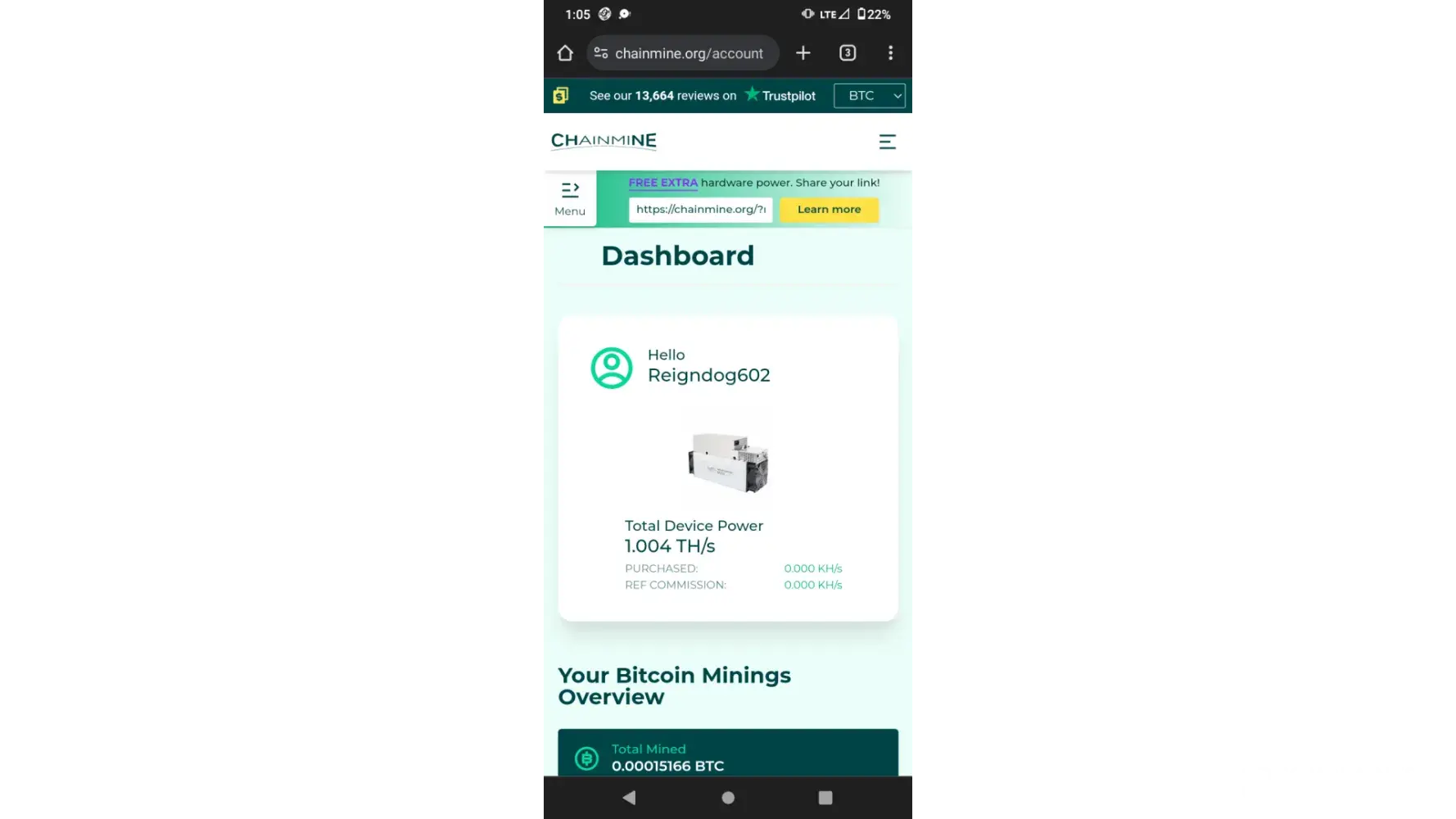 I have just Upgraded my Chainmine account for mining Power sent to address: