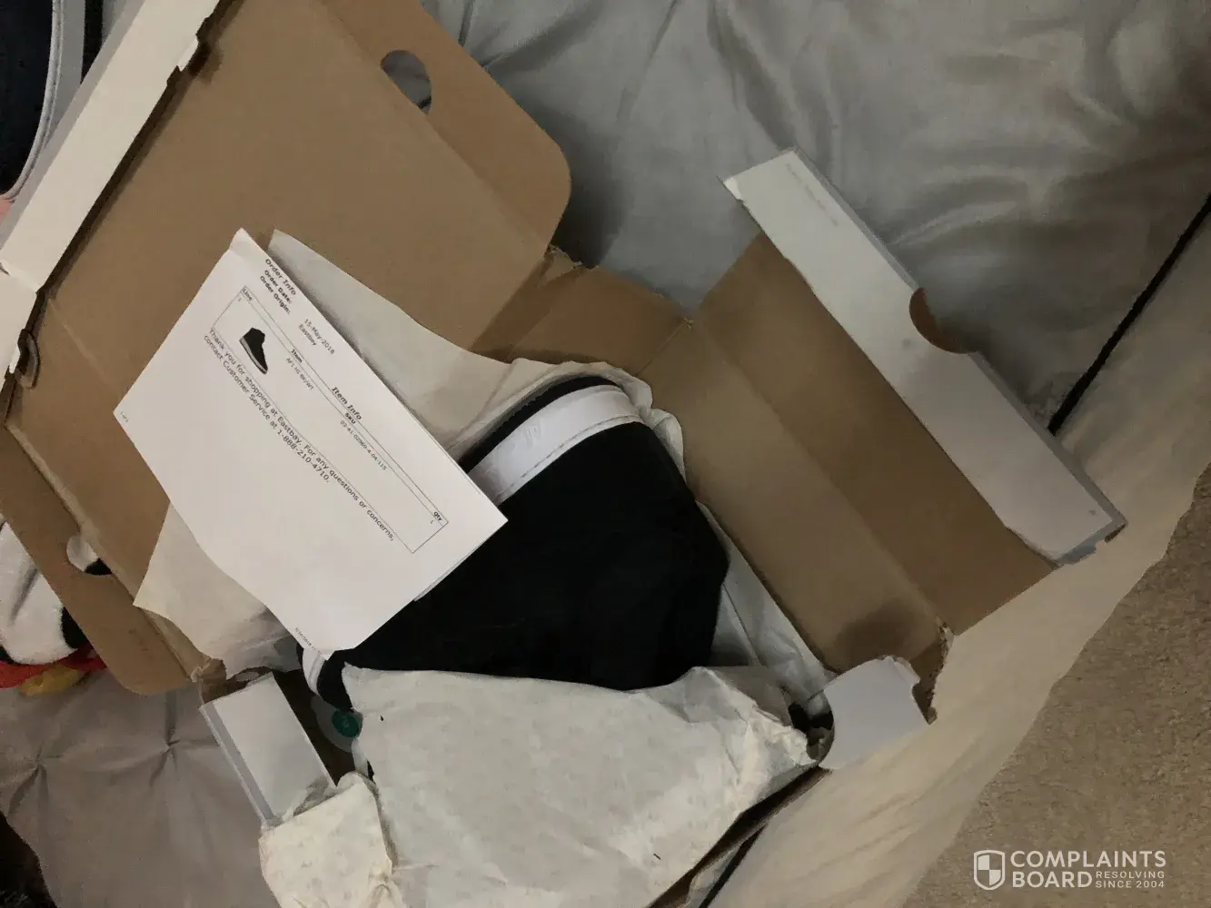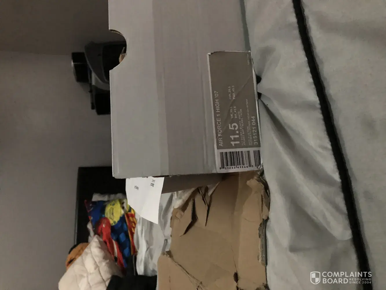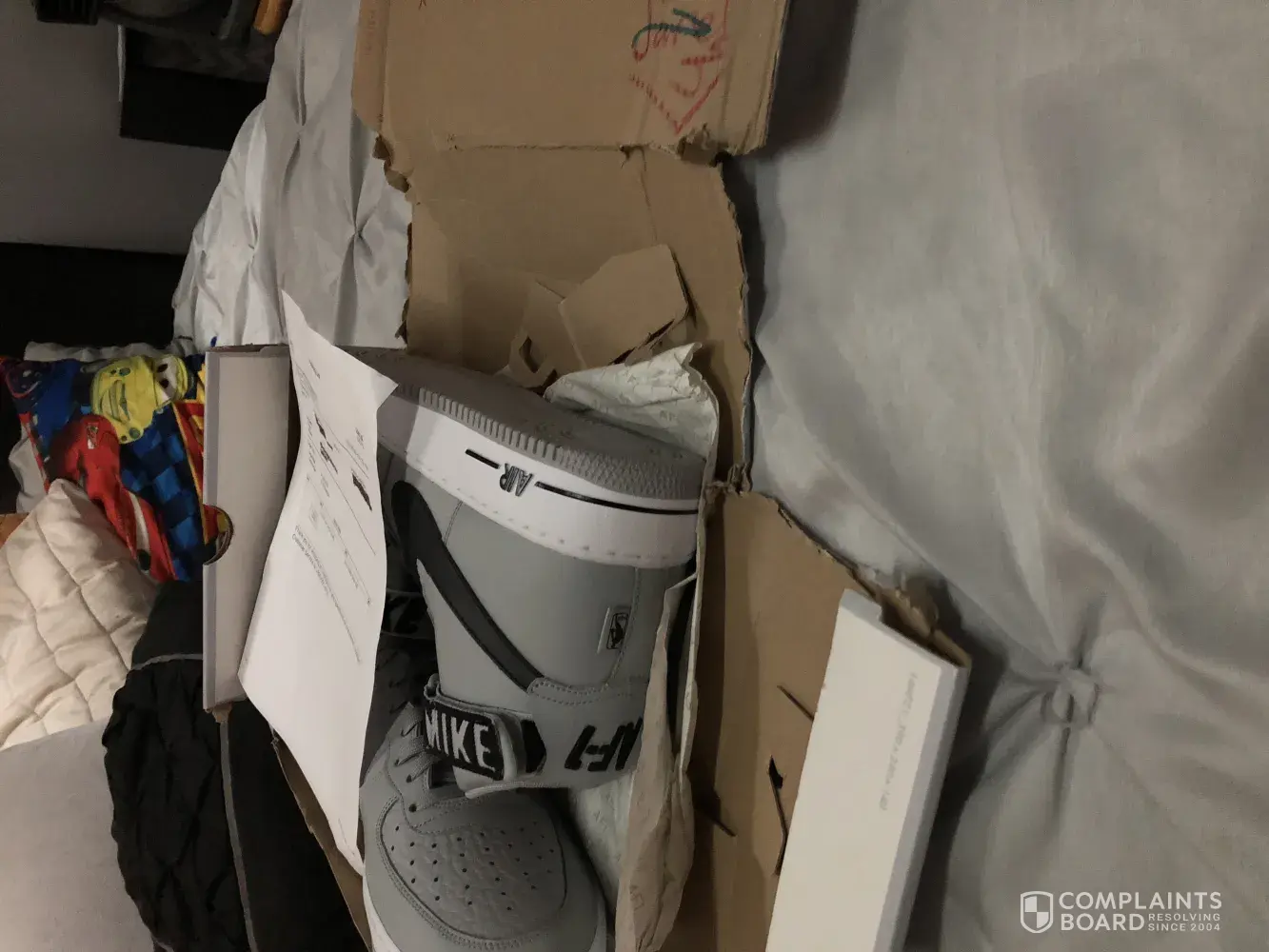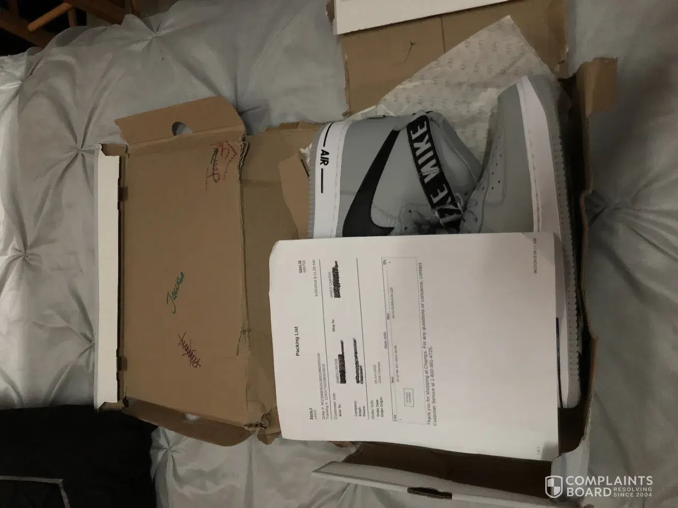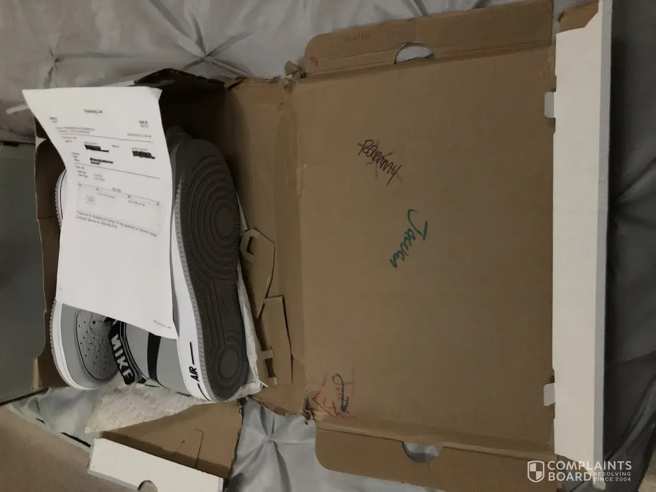 I paid for Nike AF1 hightop and received a box that they came in not even recognizable, the sides cannot even hold together, they're are names signed in the box, I shouldn't have to not be able to have my shoes in their box, but his isn't the first time either, I've called customer service and they say that there's nothing they can do, it was not done during shipping. I have pictures to prove it. I'm a shoe fanatic so no way in hell should my purchased shoes show up at my door like this!