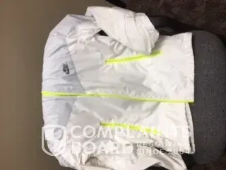 I purchased this White Nike Jacket with light gray trim and a bright fluorescent yellow zipper last summer at Champs at Coastal Grand Mall in Myrtle Beach, SC. My son has worn this jacket about 5 times since then. Recently when he went to put it on he noticed that the zipper is already broken. Due to the color of the zipper it is not able to be replaced. It matches the pockets on the front of the jacket which are also zip pockets with the same color zippers. I took the jacket to my seamstress who stated that first it would cost me $25.00 for her to replace the zipper but also she would not be able to match the color. With that being said, the jacket can no longer be used because we cannot have it repaired. The jacket is in perfect condition otherwise. Normally, I would not file a complaint but I paid over $100 for this jacket and it has hardly been worn. The zipper should not have broken off with this little bit of wear. I buy Nike clothes and shoes for my children because of the quality and do not mind paying extra for this but this jacket has not held up.