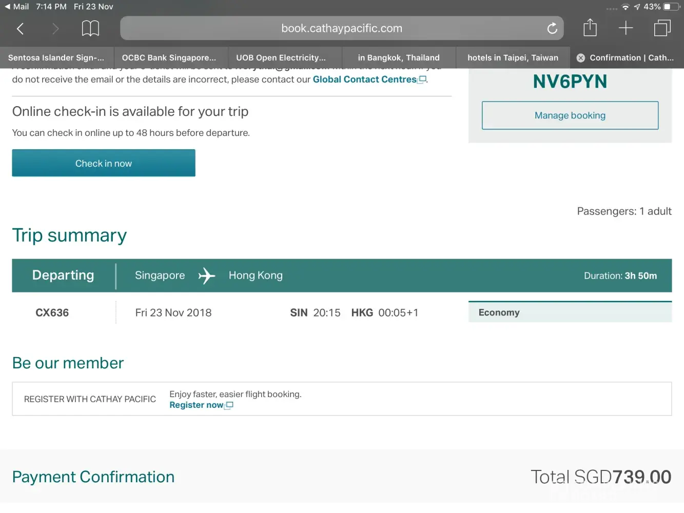 Regards to Air China flight on 23 nov 2018 17.25pm, pls check with the airline again. The airplane did not reached singapore due to bad weather and was detour to Malaysia Kuala Lumpur. I had already checked in and later then was informed the flight was detoured. Expedia could not do anything when I called their customer service. Their only reply was Friday evening to Sunday 23-25 November, China Airline customer service