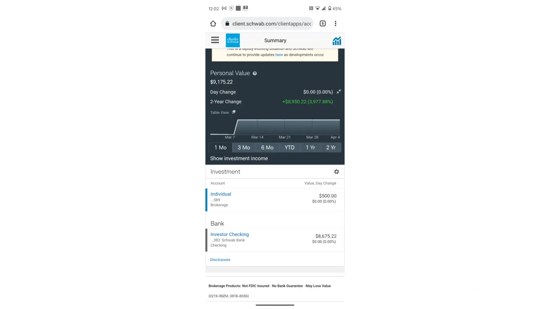 Schwab contacted me, challenged my review and asked me to relook at it. It is a friggin’ disaster. A formerly useful app is now made of screens which are 90% white space. There is NO WAY to do the basic functions such as looking at your holdings as a list and seeing how they’re doing.