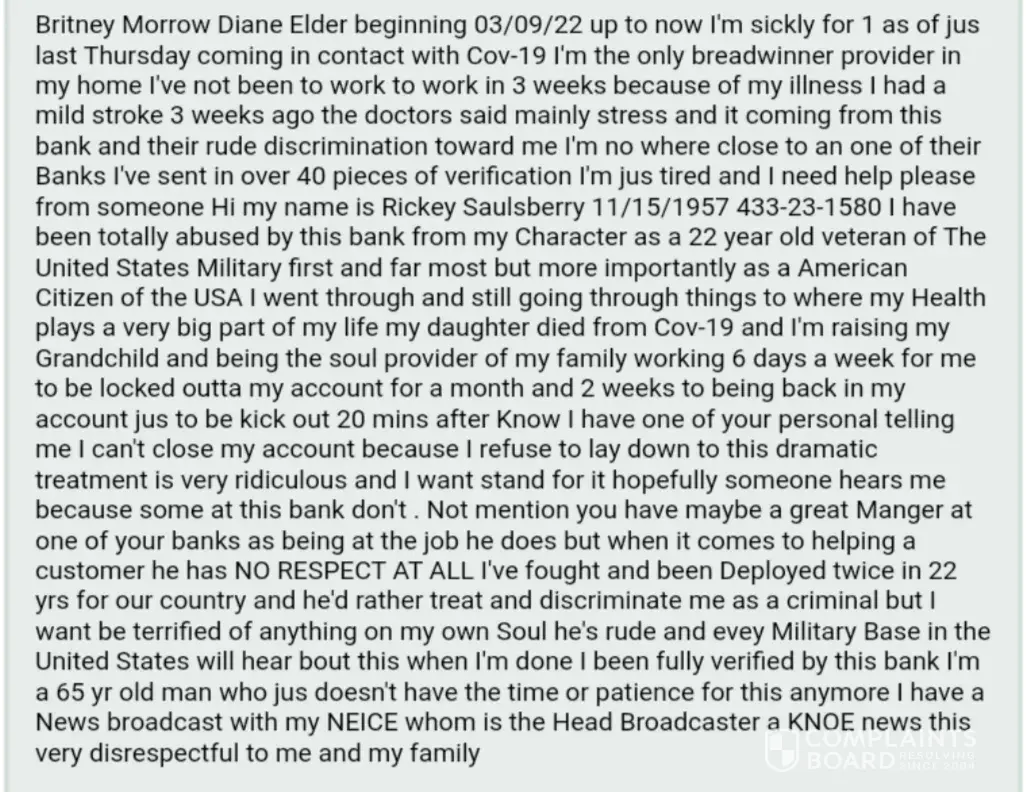 Hi my name is Rickey Saulsberry 11/15/[protected] I have been totally abused by this bank from my Character as a 22 year old veteran of The United States Military first and far most but more importantly as a American Citizen of the USA I went through and still going through things to where my Health plays a very big part of my life my daughter died from Cov-1 9 and I'm raising my Grandchild and being the soul provider of my family working 6 days a week for me to be locked outta my account for a month and 2 weeks to being back in my account jus to be kick out 20 mins after Know I have one of your personal telling me I can't close my account because I refuse to lay down to this dramatic treatment is very ridiculous and I want stand for it hopefully someone hears me because some at this bank don't. Not mention you have maybe a great Manger at one of your banks as being at the job he does but when it comes to helping a customer he has NO RESPECT AT ALL I've fought and been Deployed twice in 22 yrs for our country and he'd rather treat and discriminate me as a criminal but I want be terrified of anything on my own Soul he's rude and evey Military Base in the United States will hear bout this when I'm done I been fully verified by this bank I'm to of old of a man who jus doesn't have the time or patience for this anymore I have a News broadcast with my NEICE whom is the Head Broadcaster a KNOE news I'll will have my day Thank you Sir. I mean I was verified by their Fraudulent Specialist team after bing locked outta my account for a month and two weeks when I was told 3-5 business days and I mite have called four times a week I sent everything I had to get verified and everyone seems to tell me this where the discrimination and Bank negligence came from it has been unfair to me not only as a person but has conquered my Health to the core I'm in the Ruston Rehabilitation Home 2 back to back strokes sustaing from my Doctor has documented Stress Stoke and bad anxiety it all steams from this bank whom screws over people and over people My whole left side has been compromised severely and this bank cares nothing I was verified by Mrs. Brittnay MORROW Fraudulent Specialist of Charles Schwab Bank SBB & Supervisor of the Fraudulent Specia list Team both verified my account and release the restri ctions I was in my account only 20 mins to get kicked back out and locked out again 9,150.00 that they've told me they're going to keep I want my account c losed I've sent in three notarized letters stating want my account closed. State of Texas please are you gone let this bank treat me li ke this I even received Flowers from Fraudulent Specialist Morrow on the passing of my Daughter whom now I have her child my grandson I'm raising. This bank is toying with my life and My pride of been Deployed twice away from my family for our freedom the State of Texas is sitting back watching this smh. I waited patiently a month and two weeks after his bank told me 3-5days they have my Social security card my ID they let me open account only to close it and steal my money Help someone. It's is if they want me to steal a wheel chair in roll to a branch 6 hours away from me I jus had to do ID Verification with IDME to get a account fo r my Online tax Transcript witch we did through Video and I was verified and I have received my taxes since then. You can send Policeman and Fraud specialist to my home if you like or better yet here to the Ruston Rehabilitation Home in Ruston, La I AM STUCK IN THIS HOME BEHIND THIS MESSY CRAP FROM THIS BANK BUT WILL JUS PREPARE FOR A CIVIL SUIT THIS WEEK WILL CONT ACT NCAACP and the Civil rights organization I am tried Please describe how you vvould I want my account closed and my 9, 150 out of this account they're are treated me saying they want close my account witch they have closed and jus took my I'm tired and I want to be treated fairly