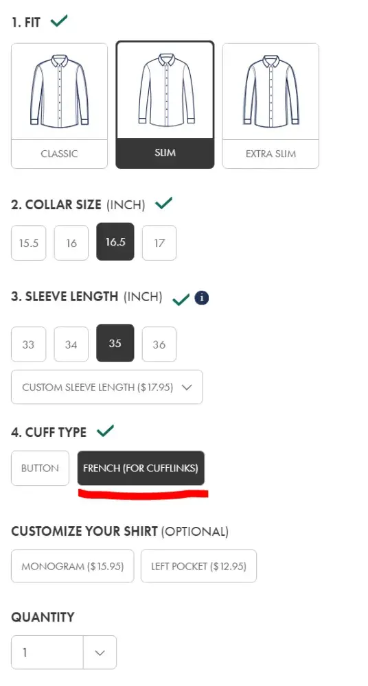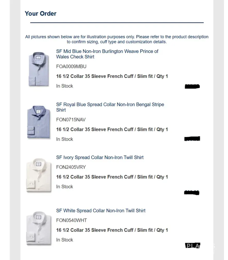 After reviewing your order and previous communications with our customer service team, I understand that you ordered four shirts with French cuffs, which require cufflinks. After receiving the order, you contacted us to indicate that you had intended to order shirts with button cuffs.