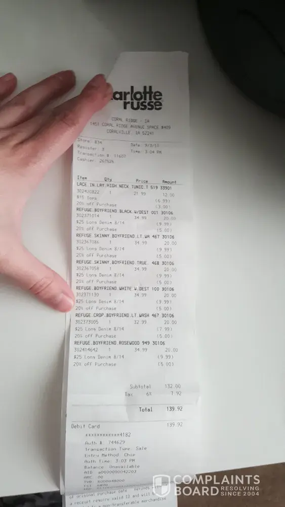 - Despite a high level of trust, our investigation found issues with Charlotte Russe's service, including poor customer service, lack of accountability, and responsibility to resolve complaints. Customers may face long wait times for responses, receive generic or unhelpful answers or no response at all. Only 23% of 1 complaints were resolved.