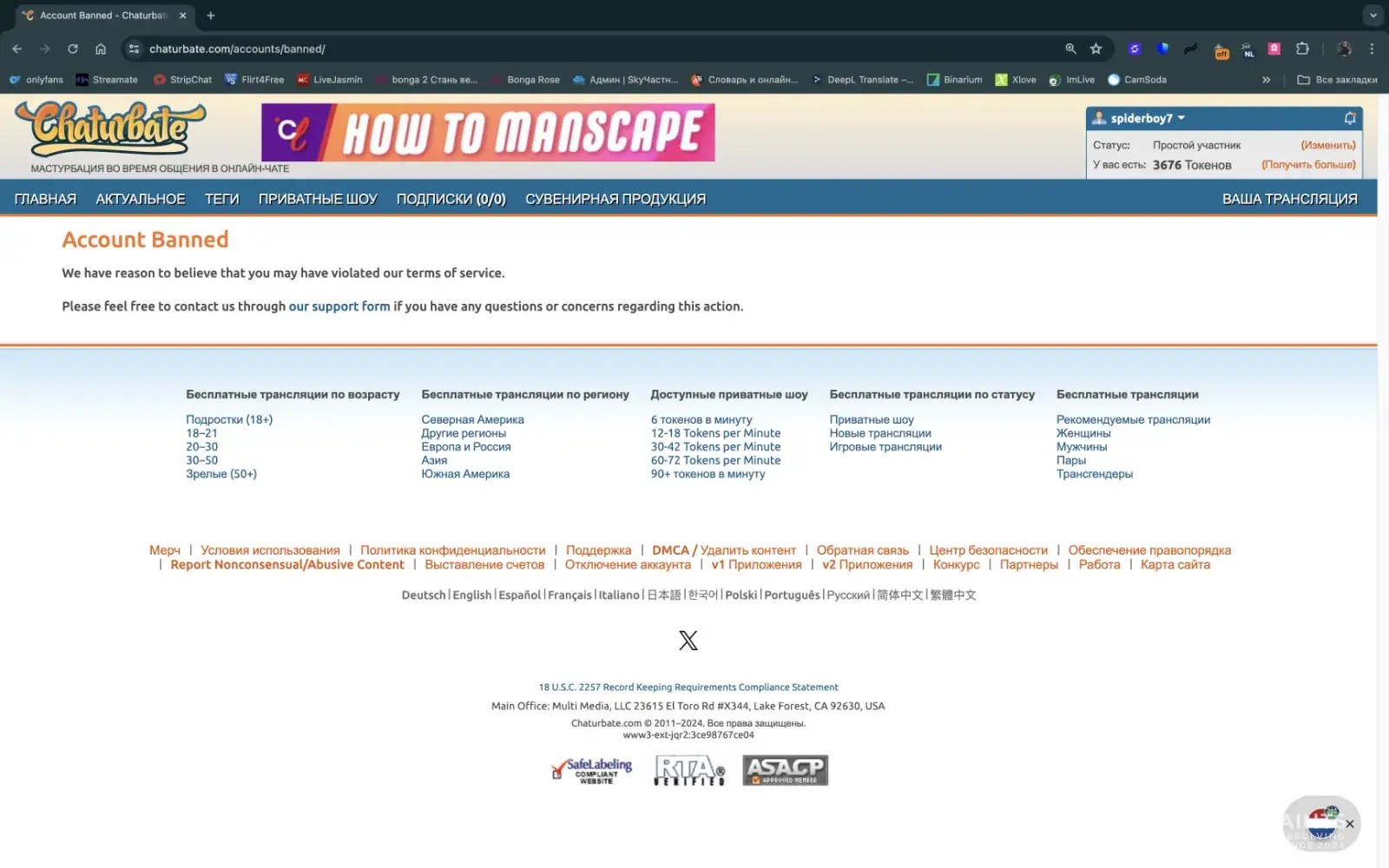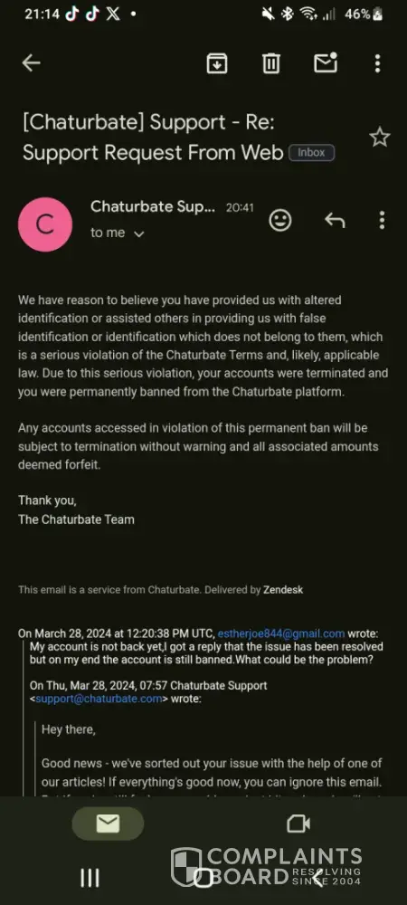Hello 13.11.2024 I received a banner on the bush_woman account I kept sending email , meanwhile I searched on several platforms , form , form , but in the end they sent me an email on 22.11.2024 where they specified that I violated the terms and conditions and to lift my suspension to respond to email , I replied but they did not unlock my account, and I did not receive the money either , I tried to ask for help on form ambercutie where is a representative from Chaturbate more exactly a support and still insisted that I received email with ticket and can not do anything for me Chaturbate ', and I didn't get any email with ticket 'em, 'cause , and today I made a new post to demonstrate what email I received and as a reward I received bann on form ambercutie , and I did not receive the money ! Can you help me please ?