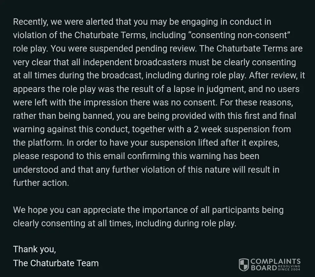 Suddenly my account banned on January 25th 2024 , according to chaturbate they say we did role play