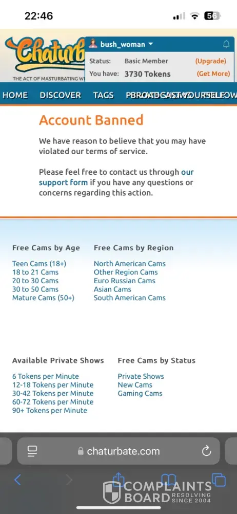 My account was working fine until out of no where it said I was banned. I had purchased tokens too and was told to contact Chaturbate Support. I did that, and they still have banned my account . They said I violated their terms, but my account was in good standing and I had not done anything other than send tokens. When I replied asking what they were referring to , they stopped replying to me. It's been a while now, so I do not think they will ever reply. This is unfair as I did not do anything to violate their rules and all the saved private shows I purchased are now gone.
