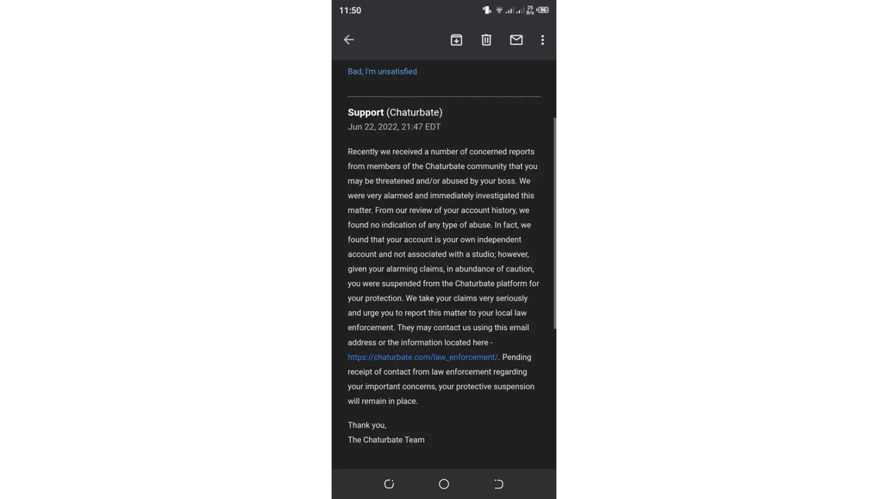 Recently we were alerted you may be discussing content in serious violation of the Chaturbate Terms, including the sexual abuse of minors. After reviewing this matter, in accordance with our zero-tolerance policy with respect to the abuse of minors, your account was terminated and you were permanently banned from the Chaturbate platform. In researching this matter it does not appear the tokens in your account were connected to such discussions, as such, they will be disbursed to you on our next payment date. Should you create or access any accounts in violation of this permanent ban, such accounts will be subject to immediate termination without warning and any amounts associated with such accounts will be deemed forfeit.