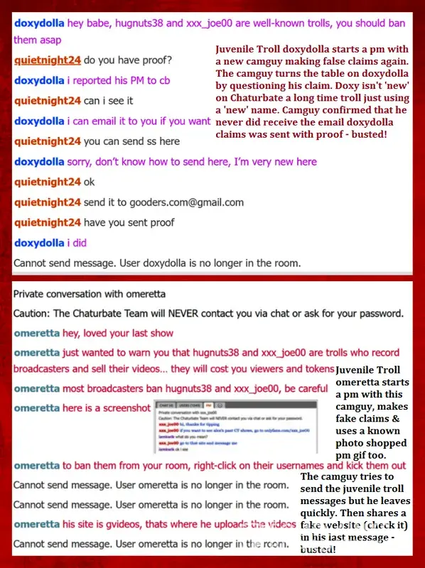 These are the 5 Juvenile Troll usernames to watch out for right now... princeofcalabas, doxydolla, omeretta, divadeva, livgolf4me and ryanbreslow . These Juvenile Trolls are confirmed to be the ones who send camguys pm's or anonymous tip notes falsely claiming certain viewers are recording them, their moderator is silencing tippers, other sham stories.