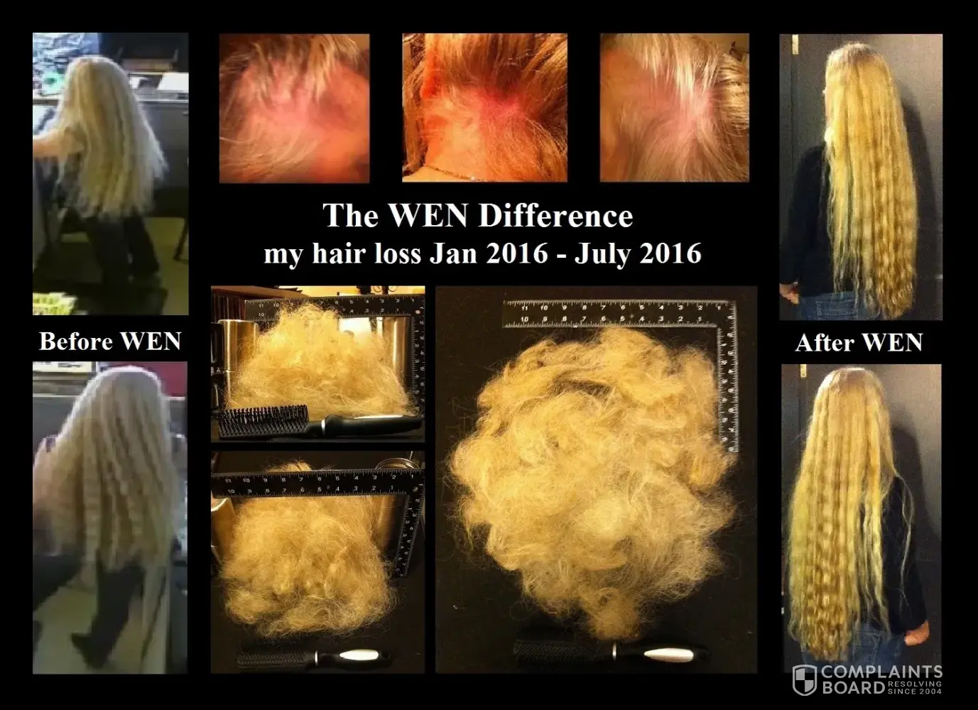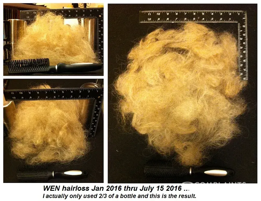 I had spent months and months switching back and forth between the shampoo brands and even tried WEN again a few months back, in an effort to restore my hair to its former state, but couldn't figure out why I was having so much trouble with it. Quite some time later I ran across information regarding the hair loss by other WEN users and I then realized that it was this product. I've now lost approximately two thirds of my hair volume, including a large chunk of hair on the left side of my head above the ear, that came out all at once in my hair brush one day. I've included photos of how my hair used to look and what it looks like now.