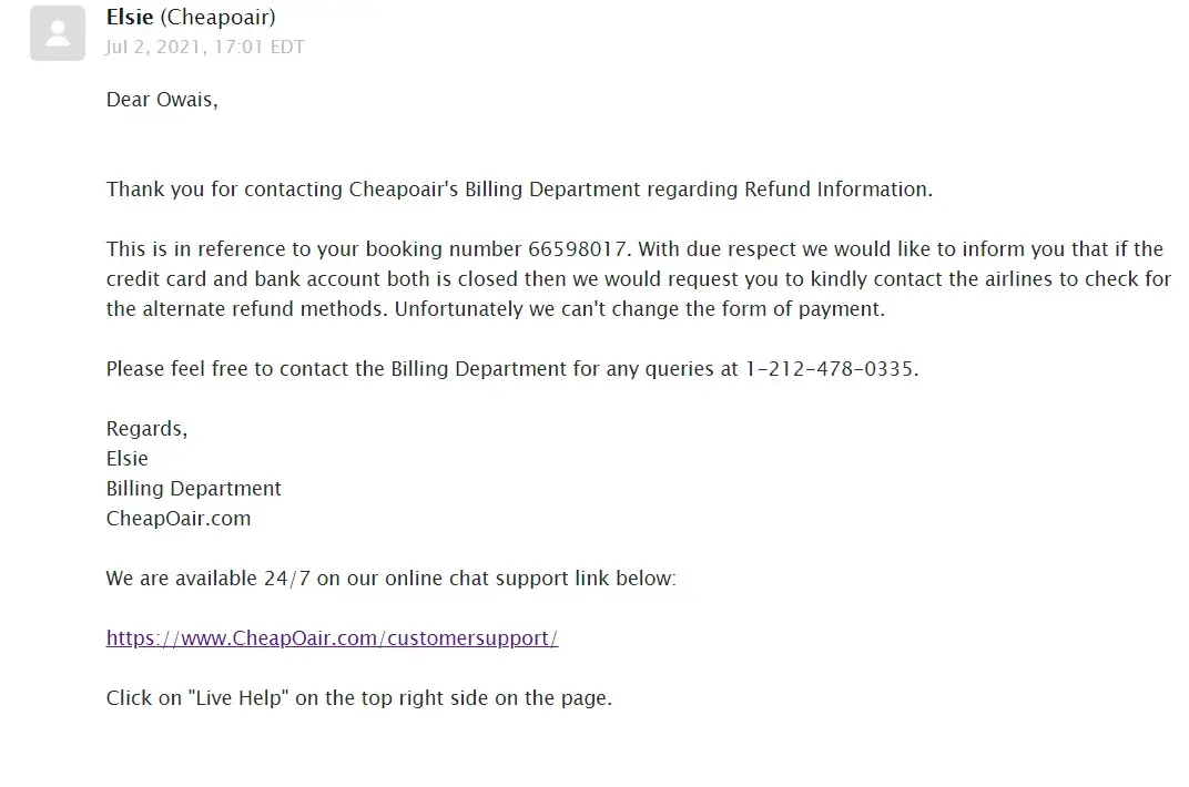 I have requested for refund of my mentioned booking number ([protected]). I purchased the ticket last year and due to COVID-19 was unable to travel. Finally, I received an email for refund eligibility and I requested it. Unfortunately, the credit card I used to purchase the ticket is no more valid/ operational as I moved out from that country (Oman). I requested the customer support and billing team to process the refund on my current bank account but they refused and asked me to check with the bank or Air Canada. When I checked with Air Canada they told me CheapOair should process the refund on your account as they have charged you not AirCanada but, Cheapoair keeps telling me to check with the bank whereas, the bank states that credit card was closed for more than a year ago so kindly ask the merchant to route your payment to your bank account.