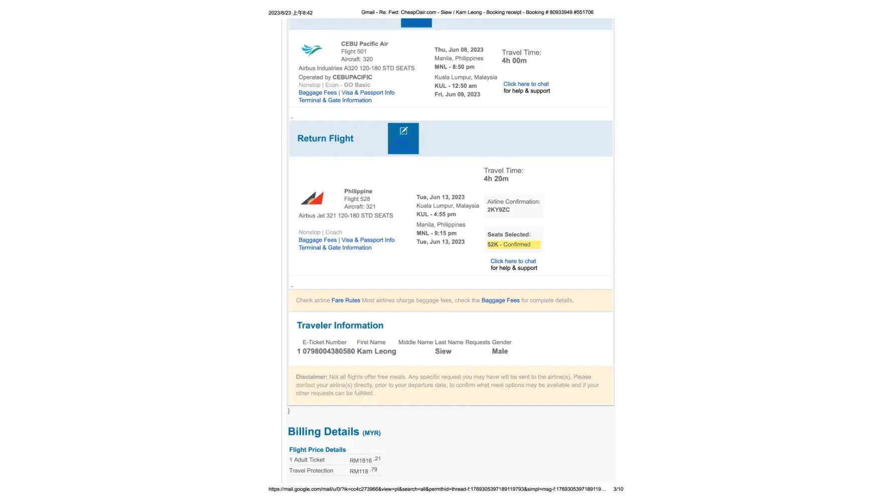 I have booking my flight from Manila to Kuala Lumpur as below: