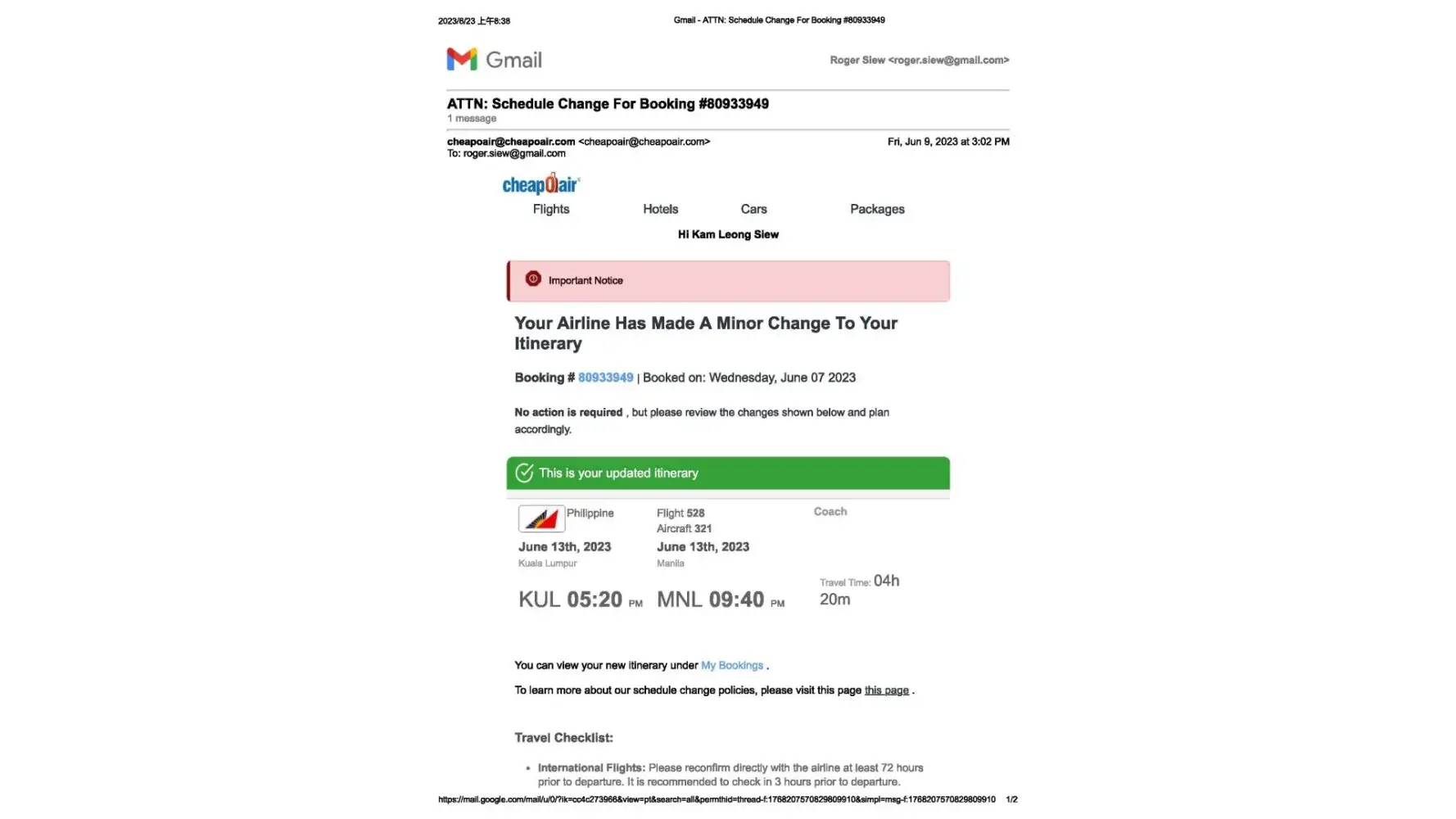 Cheapoair provided confirmed ticket for the originally booked itinerary. Thanks for resolving swiftly.