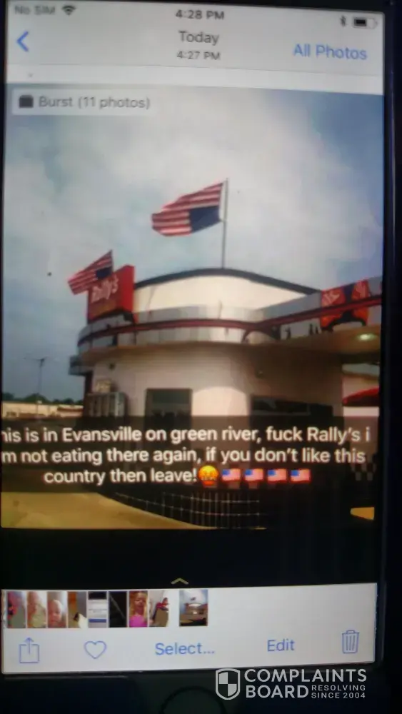 As an army vet, I was actually hoping Rally's was going to have a good explanation for this. As for the rest of us, our country is in distress right now, im sure we can all see it if we are honest with ourselves. Theres a huge racial, social, and religious divide all across America right now. Adults have lost power over there children and nobody has any respect for anybody that is different than themselves. And ladies lets not forget the leader of this great nation told us all that with money and power you can do anything you want, you can even grab women by the pussy. Women have lost there self respect but only for certain people of power. I WILL CONTINUE TO EAT RALLYS, EVERYBODY IS ENTITLED TO THERE OPINION, EVEN RALLYS EMPLOYEES. This country needs us. We shoud ask why rather than point the finger and become the executioner.