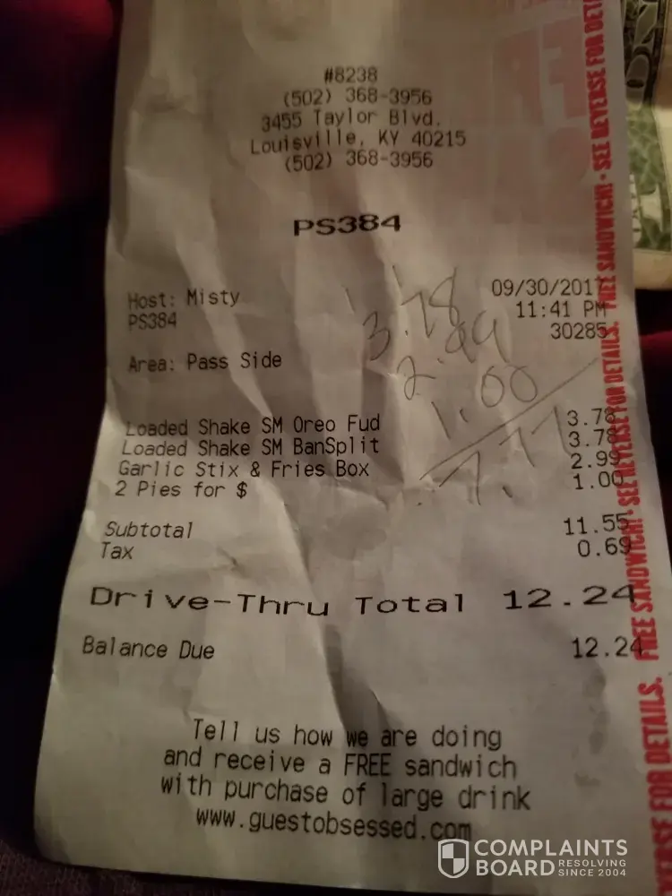 I had ordered a banana milkshake was charged for and give a strawberry cheesecake on. My 2 Apple pies were missing. Also ordered garlic park cheesticks and fries, had about 20 fries 2 cheesesticks.the only thing on order that was correct was the leadership sm Oreo fudge. So I paid 7, 77 plus tax on items that were wrong and I had to throw away. Also said they were out of popcorn chicken which was why we went