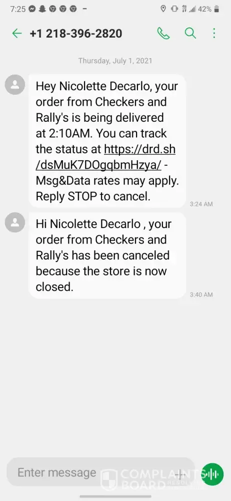 I ordered delivery and I didn't get my order and also still got charged the driver took so long they were closed by the time she got there I tried calling door dash and they said that I ordered from the checkers and rally website so they could not refund my order. I called the checkers I ordered from and they didn't answer. I'm frustrated and just want my money back