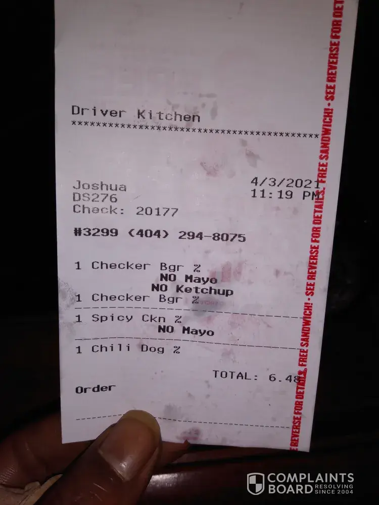 The pictures included with this grievance is one more time my order is not only wrong, this time I was given a checker burger with a bite taken. The spicy chicken I ordered with no mayonnaise. It had mayonnaise (again). I did what I normally do, eat just the chicken with the bottom side of the bun since it doesn't have mayonnaise. The burger is absolutely inexcusable.