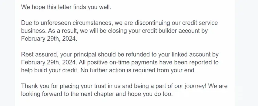 They just sent all the customers notice that their Credit Builder services are shutting down. In addition, they are reporting erroneous information to the credit report agencies. This is very upsetting, to say the least. They are financed by SynapseFi, so I would stay away from any of their affiliated companies too. In addition, they did not update the credit reports as they promised.
