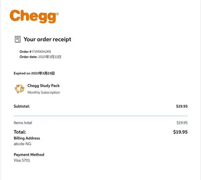I paid for a Chegg monthly subscription on 22/03/2023, I was charged, and I received an email confirmation from Chegg that the order was successful, but contritely I can't use the subscription on both the Chegg APP and website; I always receive an error prompt of subscription not found. My order number is Order # FVMXMJXN