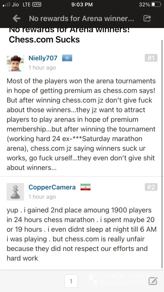 Chess.com not giving awards (premium membership) to the winners of area winners ex-***saturday marathon arena…[protected] players wasting their time, sleep on this 24 hr arena… but those top 3 also not getting anything… it's ridiculous… how evil u r chess.com! so Please No one play this type of tournaments…they r frame to attract u to play for membership…but u will get nothing