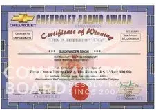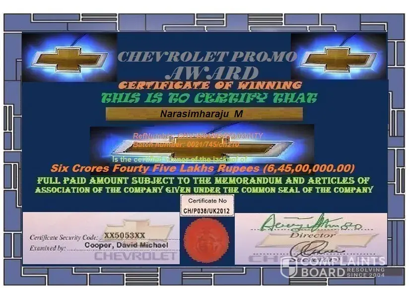 Sir, i got a sms on my mobile no [protected] from the mobile number - [protected], so that the my mobile no has won a prize rs. 3, 35, 00, 000. 00 from chevrolet promo award. He is desp an certificate on my email vide their certificate no. Ch / p038 / uk2013 comma ref number: chv - p038 / c098q / 02 / lty comma batch number:016 / 37 / fb3121. Please confirm about this what is ?. Thanking u sir,
