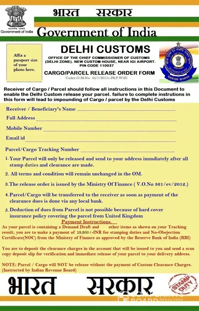 We have also attached a scan copy of the Release Order Form from the Indian Customs for you to print it out and fill it carefully and send a scan copy of it to our Delivery Agent Diplomat MORGAN SMITH so that he can submit the form to the Indian Custom Clearance Department on Arrival.
