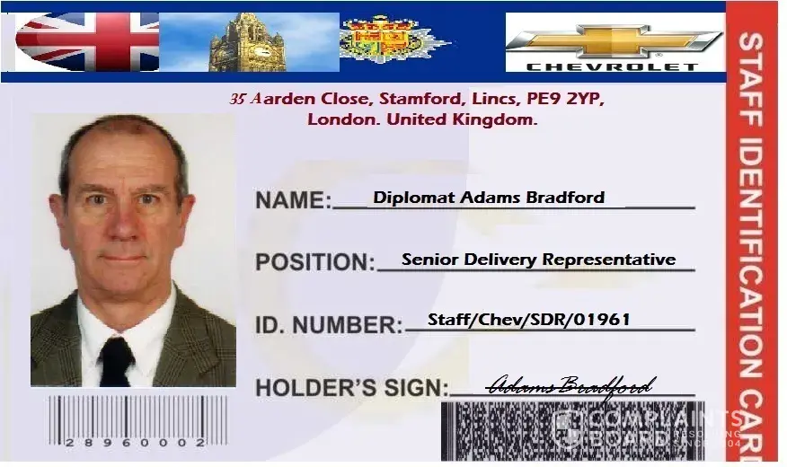 Congratulations on behalf of the ''chevrolet car promotion london, united kingdom'' our screening committee and national advisory board has completed all verification and screening by the screening committee of "uk's overseas national advisory remittance claims unit.