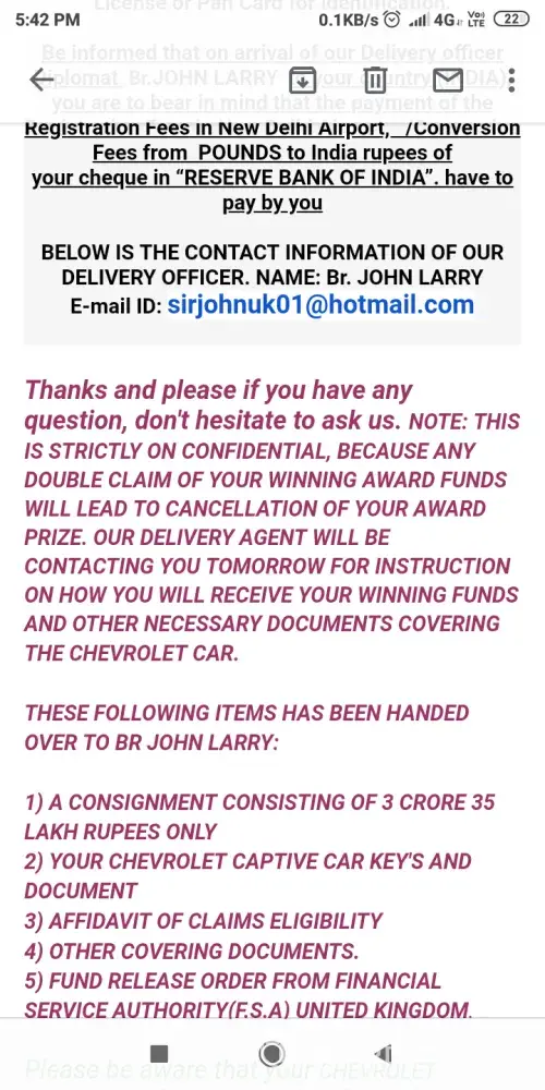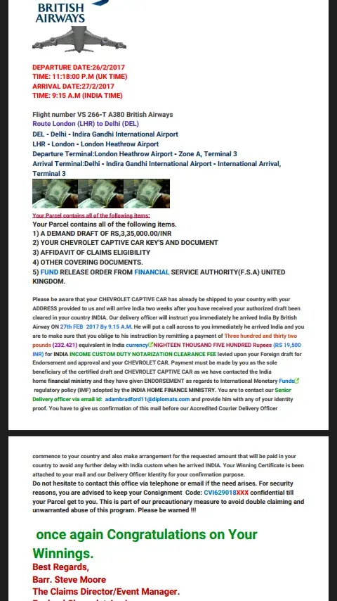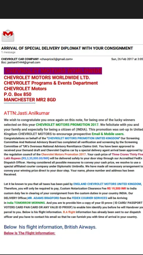 The diplomat will personally present to you all the relevant documents to guide you against any India government queries. You are advice to make the required 23, 700 INR available to the diplomat in India immediately he instructs you to do so, before you receive your prize of (£700, 000.00 pounds) 3.6 CRORES RUPEES From the ENGLAND CHEVROLET MOTOR ANNIVERSARY to enable him clear your prize from the custom. Please you must keep secret of your winning until it arrives your doorstep for security reasons.