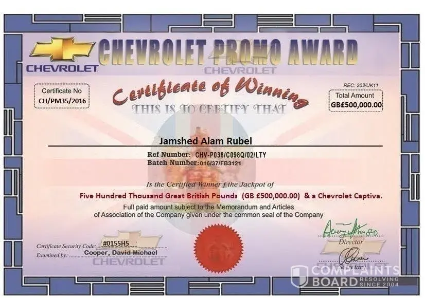 I recieved one message from cheroletcompany uk my mobile number has won (GB £500, 000.00) pounds for the chevrolet car exbition 2016 Promotion and send my email one chevrolate certified.
