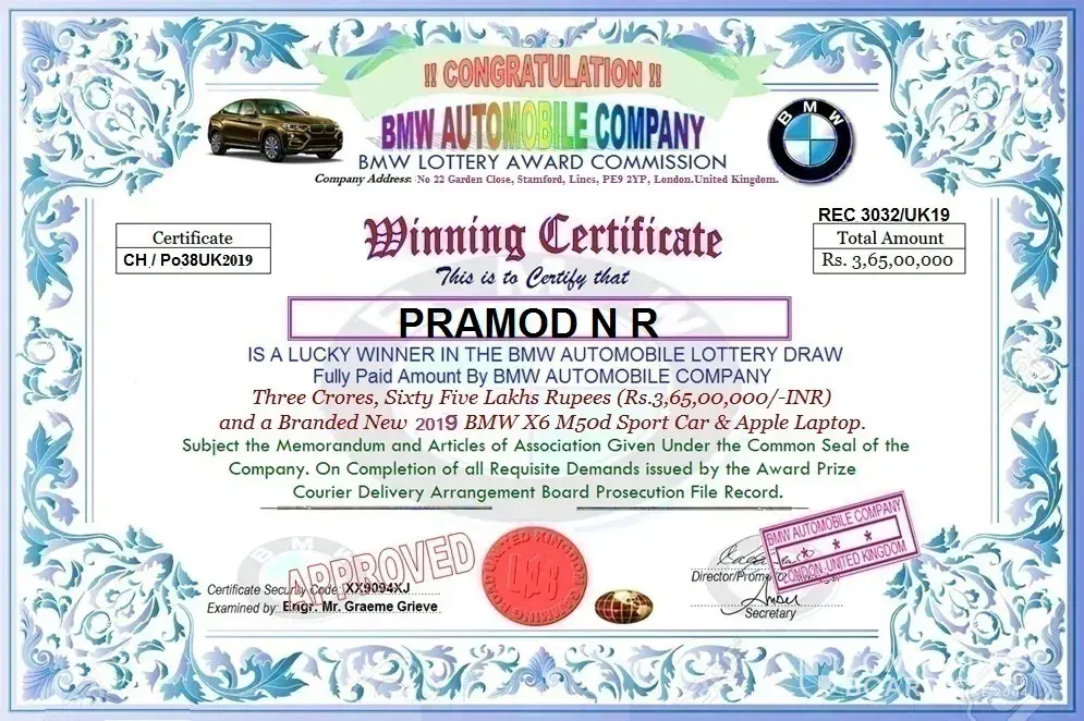 We wish to congratulate you once again on this note, for being one of the lucky winners selected on this year BMW MOTORS COMPANY LONDON PROMOTION 2019. We felicitate with you and your family and especially for being a citizen of (INDIA). This promotion was set-up In United Kingdom BMW MOTORS to encourage prospective MOBILE users. Congratulations on behalf of the ''BMW MOTORS COMPANY LONDON PROMOTION 2019'' Our Screening Committee And National Advisory Board has completed all verification and screening by the Screening Committee of "UK's Overseas National Advisory Remittance Claims Unit. You have been approved to received your Demand draft and BMW CAR with a New Laptop by a special diplomatic arrival been approved by the regulation council of the BMW Motors Company London Promotion 2019. Your cash prize of Three Crores Sixty Five Lakh Rupees (RS, 3, 65, 000.000.00/INR) will be delivered safely to your door step through our Accredited Dispatch Officer. Having considered all possible measures to convey your cash prize, we resolve to use a special affiliated courier company under Diplomatic Umbrella. We have made all necessary arrangement to convey your winning prize direct to your door step. Your name, phone number and address has been Received.Let it be known to you that all taxes has been paid by ENGLAND BMW MOTORS UNITED KINGDOM, Therefore, you will only be required to pay LOCAL Custom Duty Custom Notarization Clearance Fee RS, 22, 500 INR to India custom duty fee in clearing of your consignment from the custom duties in your country INDIA. Our DELIVERY Officer, MR. MARK RICHARDS from the COURIER SERVICES will be Arriving in India WEDNESDAY MORNING. And you are to provide him a copy of your ID prove ( ID CARD/ PASSPORT / VOTERS CARD, PAN CARD OR ANY VALID ID PROOF) to enable him identify you before he will Handover your parcel to you. Below is his flight information. B.A flight information has already been sent to our dispatch officer and you have to contact his email so that he can furnish you with time of arrival in your country.