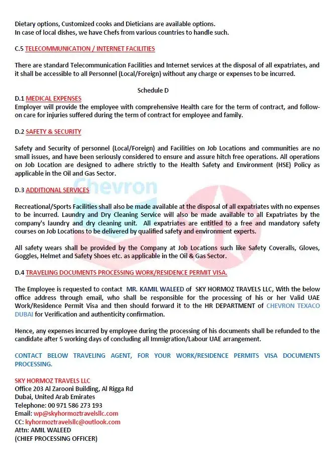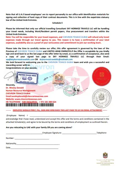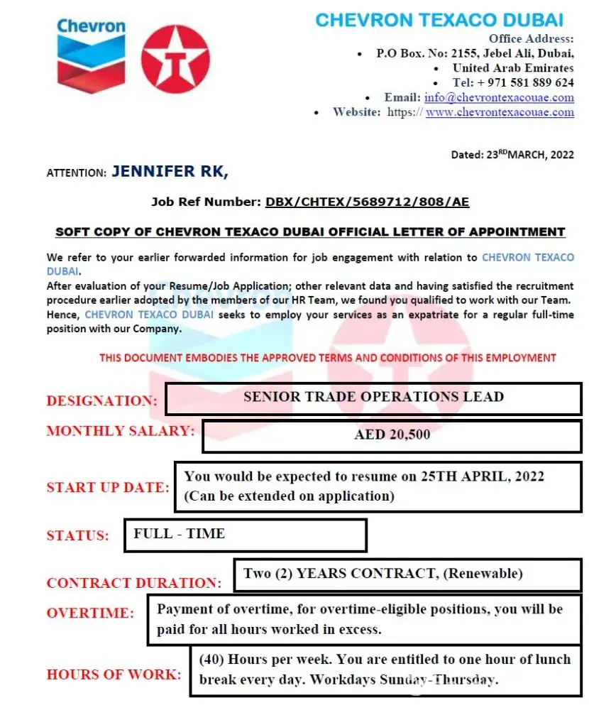 I was approached by Wesley Donald from Chevron Texaco Dubai, confirming my job application as Operations Team Lead in Dubai.There was a contract given to me asking me to join them in dubai by 13 June 2022.