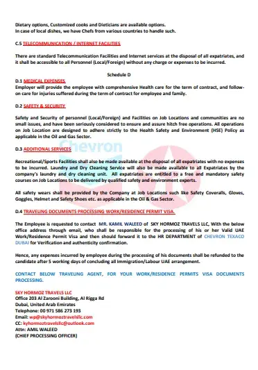 While doing these things you will be successful and so will CHEVRON TEXACO DUBAI. Your professional growth is of utmost concern for CHEVRON TEXACO DUBAI personally, because if you are growing our company will grow as well. The extent to which CHEVRON TEXACO DUBAI is considered friendly, knowledgeable, efficient, reliable, trustworthy and environmentally conscious will be measured by how others see these qualities in you. The attached Soft contract offer letter has been prepared to guide you in better understanding of Policies & Procedures and practices concerning employment with CHEVRON TEXACO DUBAI.