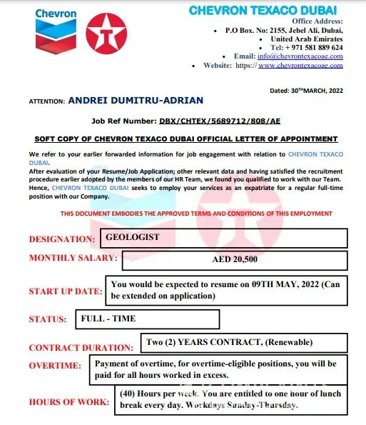 I was approached by Wesley Donald from Chevron Texaco Dubai, confirming my job application as a Quantity Surveyor in Dubai.There was a contract given to me asking me to join them in dubai by 28th April 2022.