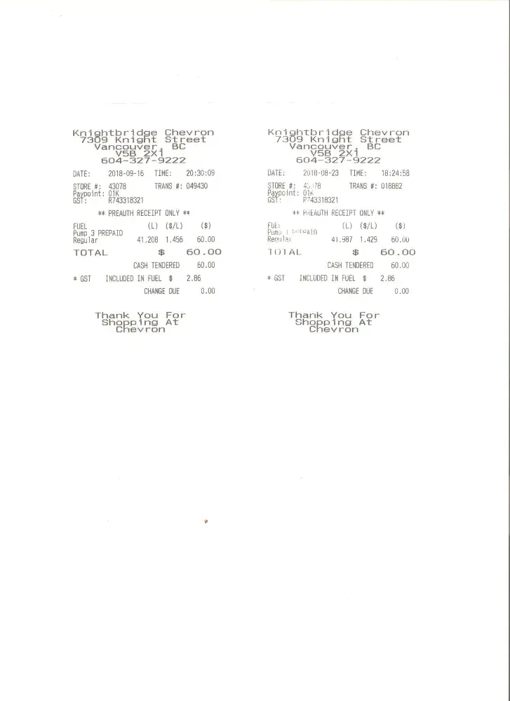 I live in Vancouver BC Canada and I wanted you to know that the Chevron Gas Station located at Knight Street and 57 ave has been ripping people off for the fuel that they purchase. I gas up there every 3 weeks and always put in $60.00 of gasoline into my car. I compared my last gas receipt from them to the one from yesterday and I'm being ripped off. Please view the attachment for my last 2 gas receipts from that Chevron location. Please carefully view how much I'm paying per liter and how many liters I am receiving... because yesterday I paid MORE per liter but received LESS gas... I have the proof...I will scan and copy my receipts for you to review. PLEASE carefully look at price per liter and how many liters I'm receiving... and BOTH times I have put in my usual $60.00 amount. Thank You. Bye Sonny Badyal
