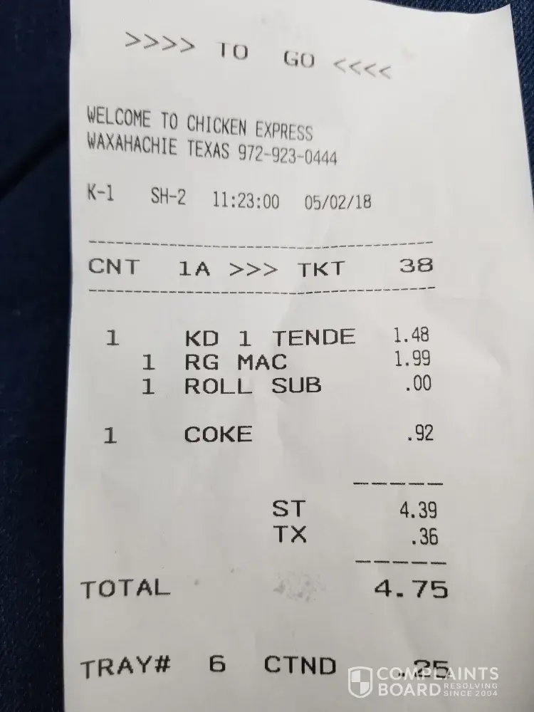 I recently went to your Lancaster, Texas store on 3/24/18 at 8:22PM and went through the drive-thru only to find out when I got home that my condiments were not in my order that I requested. Also, the food was terrible. The chicken (wing and leg) was very salty. I also order the catfish and it was rubbery and both rolls were hard. I DO NOT expect to spend $14.71 to not only get bad customer service but also bad food. I do have my receipt and would like to request a full refund.