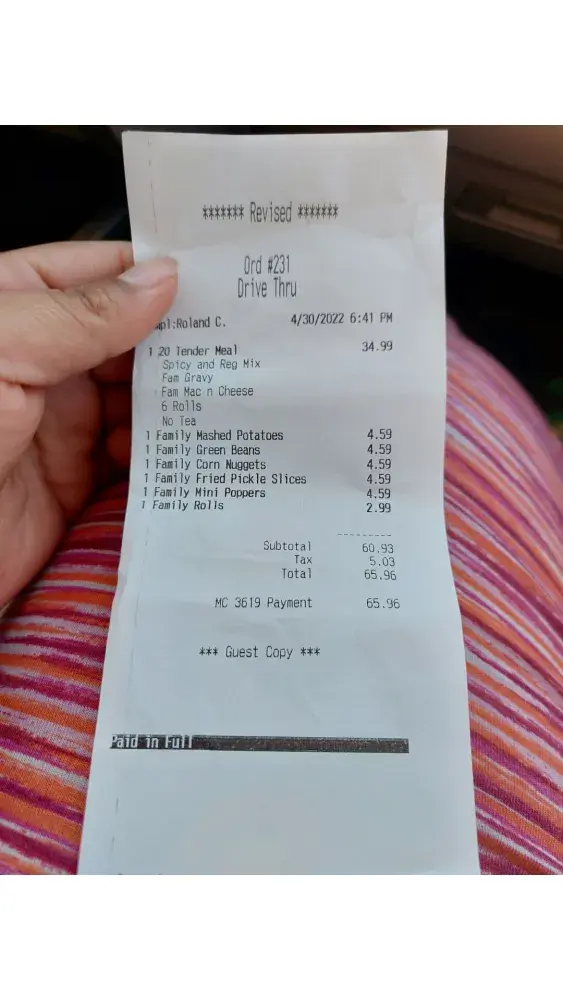 04/30/2022 ordered at 6:41pm order #231 in Mesquite, TX 75159. To begin the girl in the drive through seemed a little upset and was not kind. Second I get home and I missing my mashed potatoes, mac&cheese, fried pickles, half a dozen of rolls. I called the store when I asked to speak to manager and drove back while on hold. Took me 13 minutes to get back to the restaurant and I was still on hold. I wouldn't have mind if they could have answered or if it was one item missing but 4 items that is too much. 65 96 to get bad service and my order wrong is horrible.