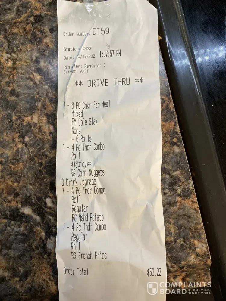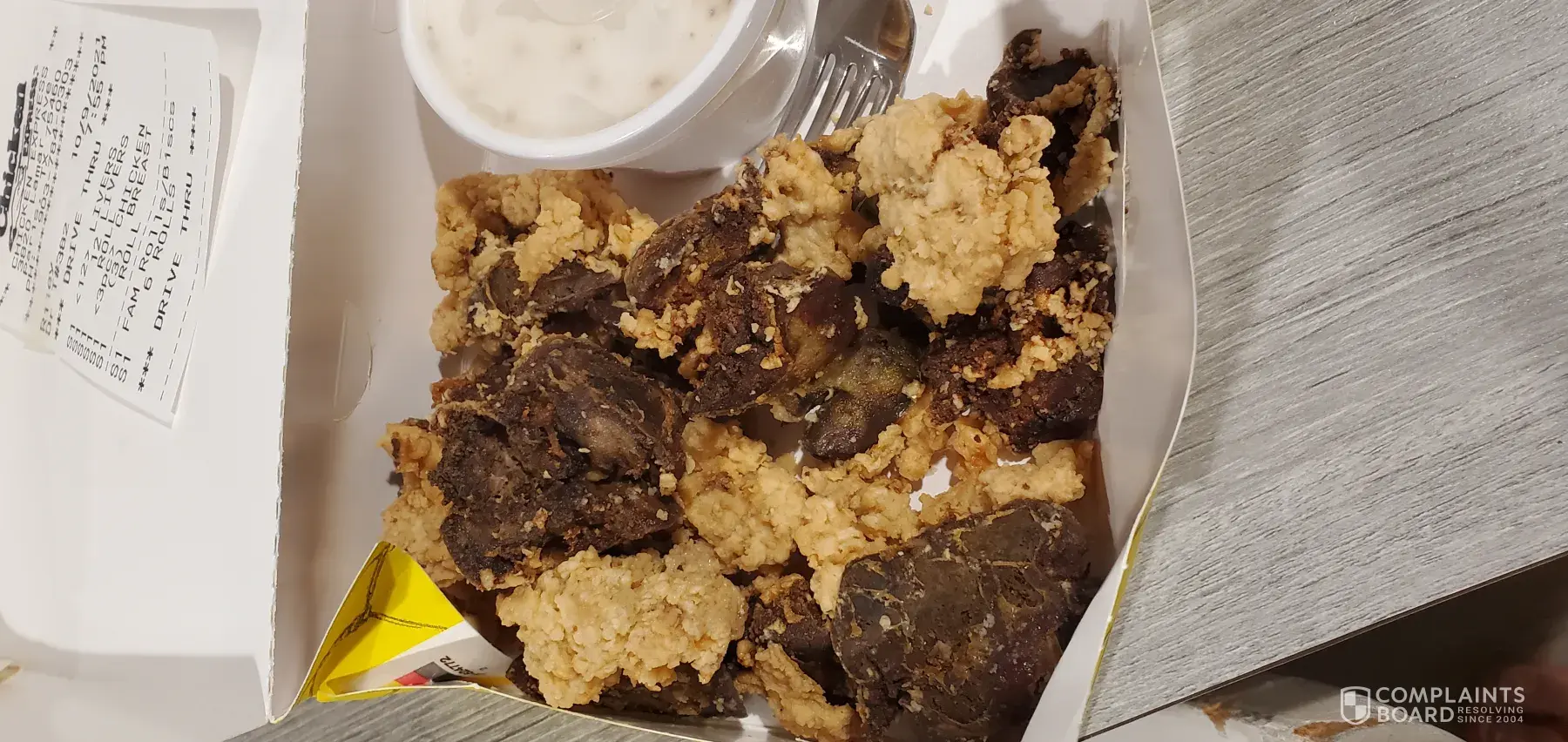 Decatur, Texas store. We ordered 2 pieces of chicken, okra, potatoes and gravy after sitting in line for 20 min. No problem. Get home open up the box and its chicken strips. Call the store to tell them about the mistake. We would not be coming back into town. So we asked for a raincheck as its is their mistake. We was told bring it back. I took it back went to the door with the open box of chicken strips. Let them know I was not happy. While standing there they mixed up another persons order taking it to the wrong car. Credit card was given to another customer and I did not see them throw away the chicken strips. We got home with the next order and there is no gravy on the potatoes. Gave us nothing for our inconvenience.