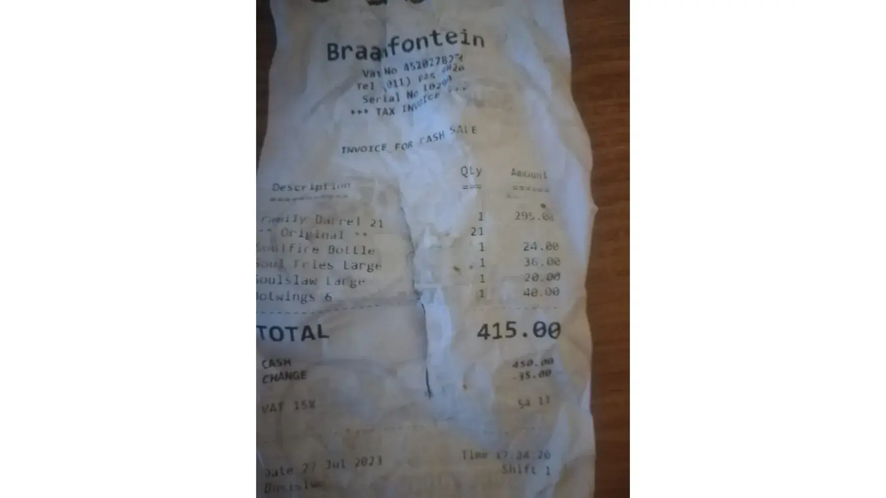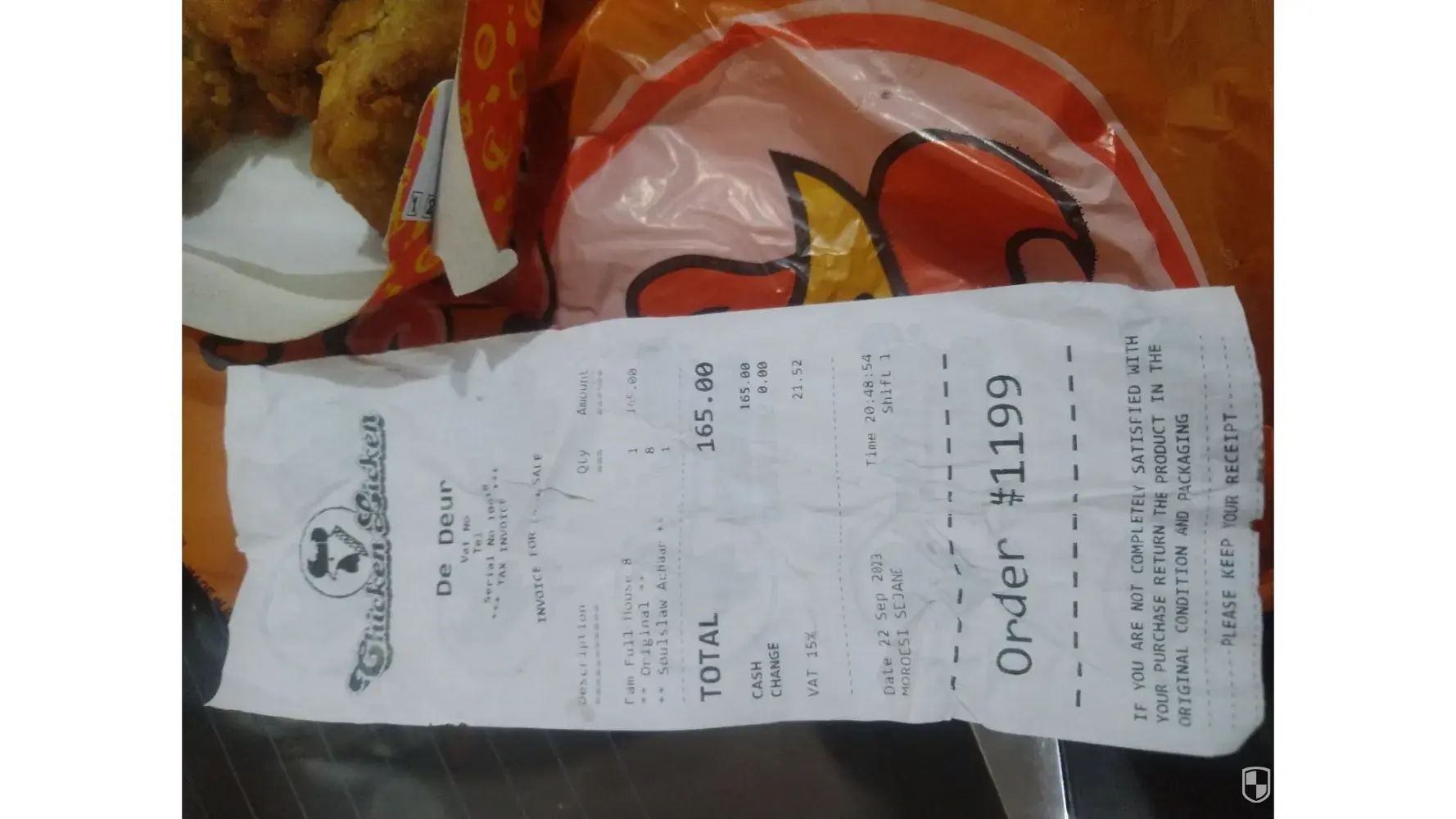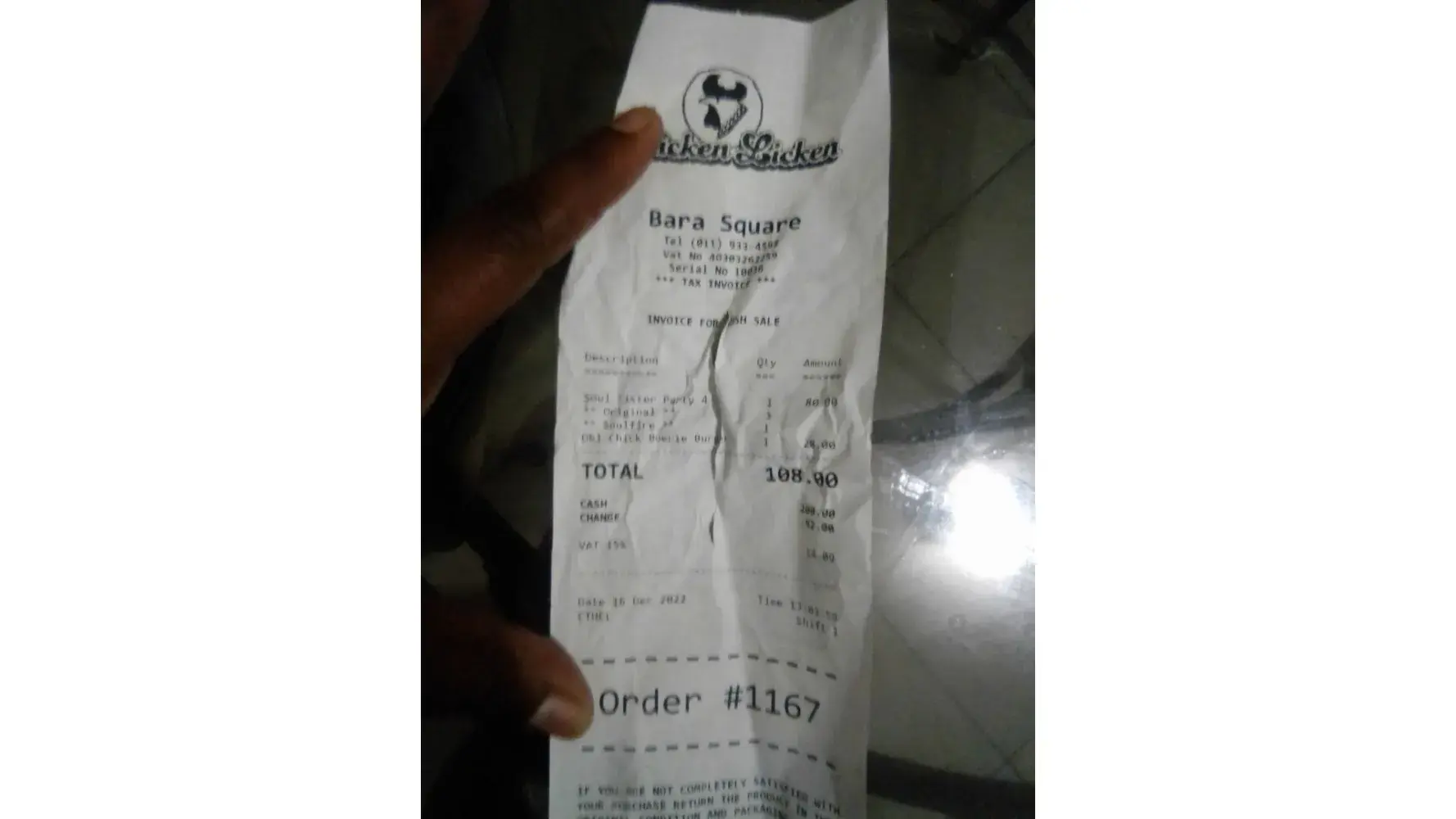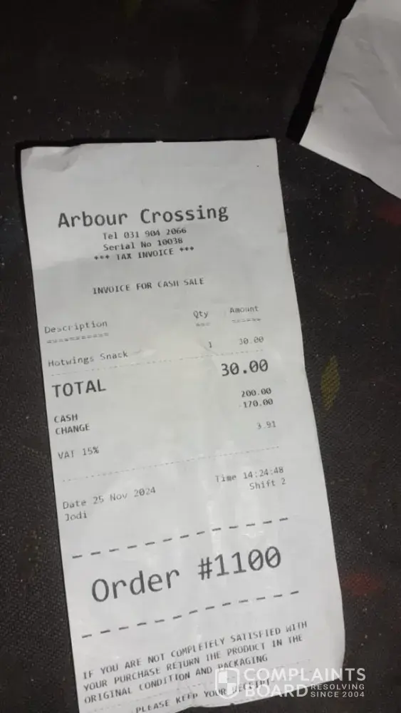 I had asked my boyfriend to buy me a hot wings snack at durban abour crossing branch, at 14.24pm.