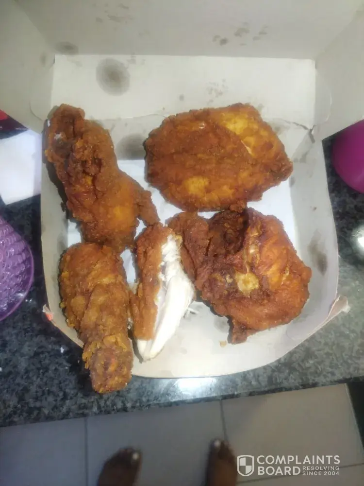I bought 6 piece of chicken today. 14 February 2024 in The Van Der Walt Chicken Licken store. Chicken was burnt. It also.tastes bitter because it is burnt. I only checked the pieces as soon I got to my flat, only to realize that they have served me burnt chicken. I also found it strange that immediately after purchasing the Chicken it didn't take them long prepare it. It's almost as if the chicken was returned by an unsatisfied customer and Most pieces are white meats.