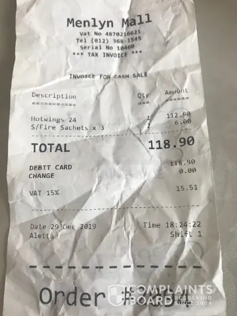 you charged R112.90 for 24 winges that is R4.70 per wing that is a size of a toothpick. Please change your buyer and put in a standard.Give the customer what he is paying for otherwise you are ripping people off, you posting big profits at the public expense, for how long?