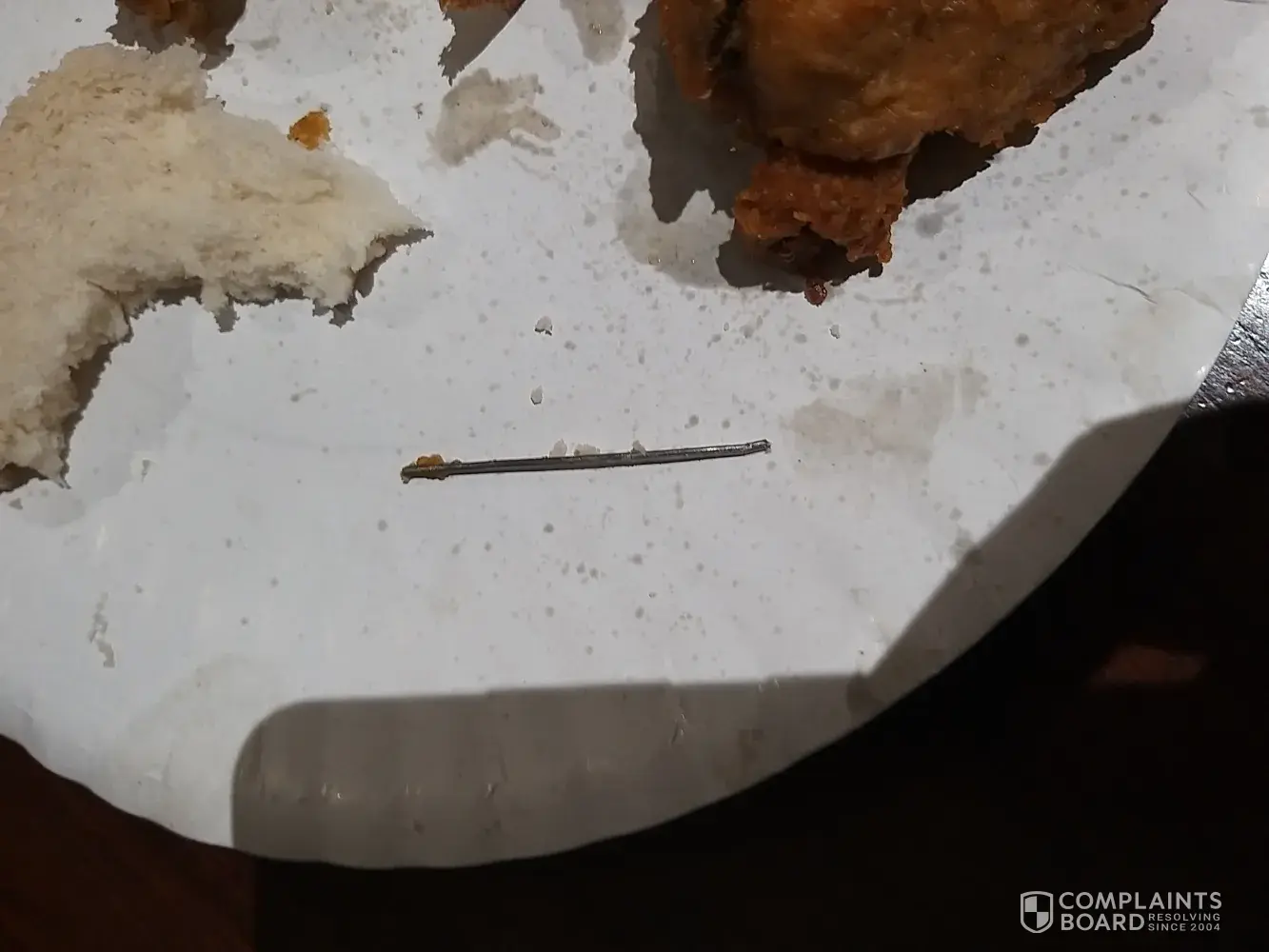 My 9 year old son took a bit on a chicken wing and bit onto a steel pin that was inside the chicken wing he immediately screamed as he hurt his tooth we inspected the chicken and found a steel pin inside the chicken wing something so strange and something i have never seen before !