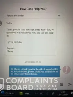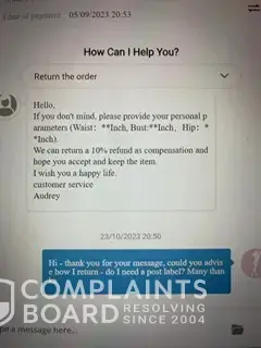 ChicMe customer team then wrote to me to offer me 10% to keep the items to which I said I wanted to return still, then the next message they offered me 25%, I still said I wished to return, then I received another message which offered me 30% to which I said no, I still wished to return.